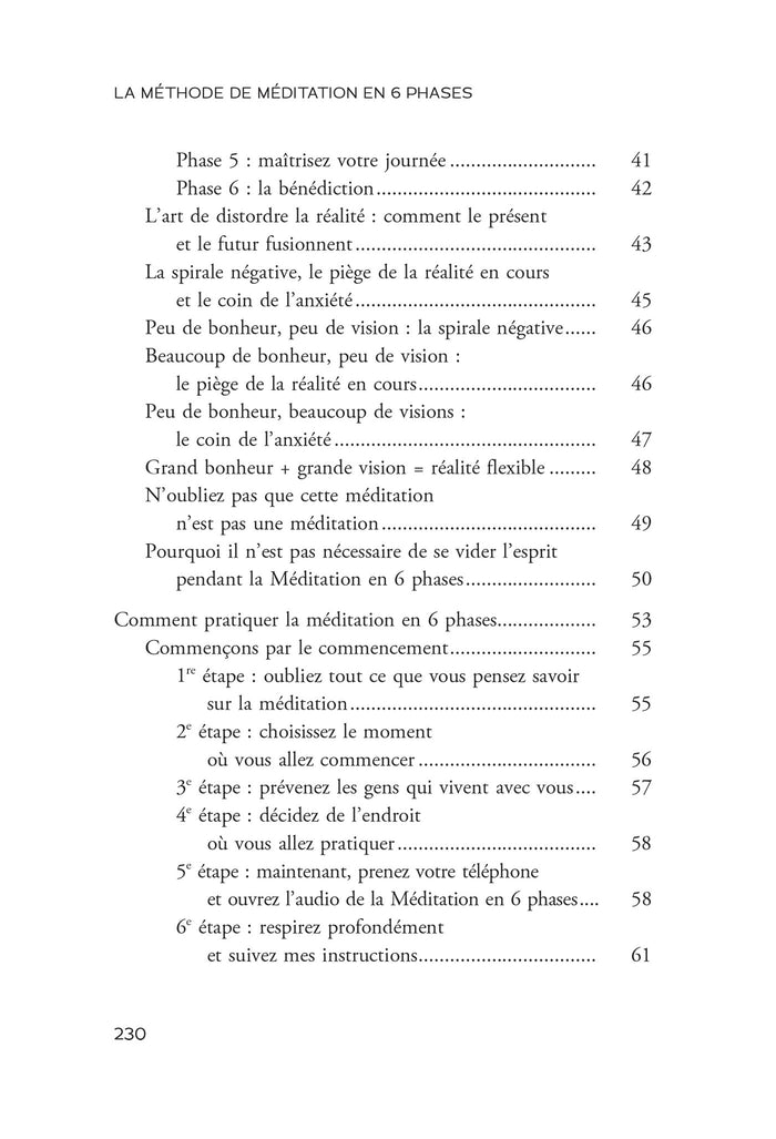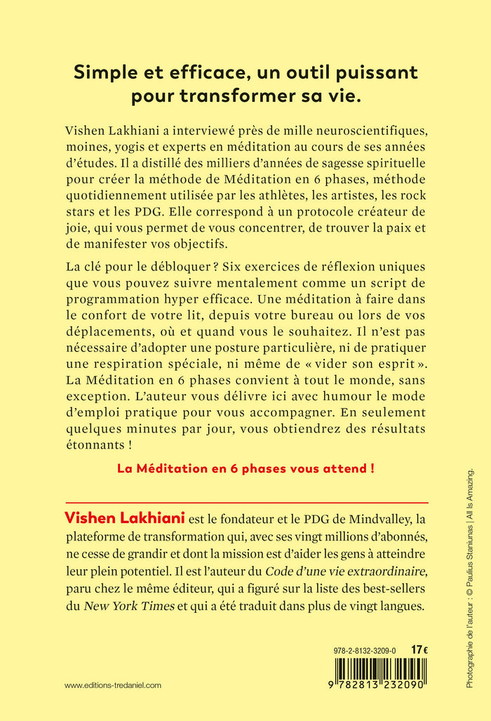 Note biographique VISHEN LAKHIANI est le fondateur et le PDG de Mindvalley, la plateforme de transformation la plus puissante du monde, avec ses vingt-millions d'abonnés, qui ne cesse de grandir et dont la mission est d'aider les gens à atteindre leur plein potentiel. Il est l'auteur deLe code d'une vie extraordinaireparu chez le même éditeur. ,PrésentationEn quelques minutes par jour, boostez votre esprit, manifestez vos rêves et voyez la magie opérer ! Simple et efficace, un outil puissant pour transformer sa vie. À la tête d'une révolution dans la méditation, l'entrepreneur et auteur à succès du New York Times, Vishen Lakhiani, a interviewé près de mille neuroscientifiques, moines, yogis et experts en méditation au cours de ses années d'études. Il a distillé des milliers d'années de sagesse psycho-spirituelle pour créer la méthode de méditation en 6 phases. Utilisée quotidiennement par les athlètes, les artistes, les rock stars et les PDG, cette méthode est un protocole magique, créateur de joie et qui vous permet de vous concentrer, de trouver la paix et de manifester vos objectifs. La clé pour débloquer toute cette magie ? Six exercices de réflexion uniques que vous pouvez suivre mentalement comme un script de programmation hyper efficace. Vous pouvez faire cette méditation dans le confort de votre lit, au bureau ou dans les transports en commun, où et quand vous le souhaitez. Aucun ennui, aucune respiration spéciale ou nécessité de " vider votre esprit " n'est requis. Peu importe à quel point vous êtes occupé, sujet à un esprit vagabond ou allergique à la posture du lotus, la méditation en 6 phases convient à absolument tout le monde, sans exception. En seulement quelques minutes par jour, constatez les effets positifs qu'elle aura sur votre vie. L'auteur vous délivre ici avec humour le mode d'emploi pratique pour vous accompagner dans votre voyage. La méditation en 6 phases vous attend. Afficher moinsAfficher plus