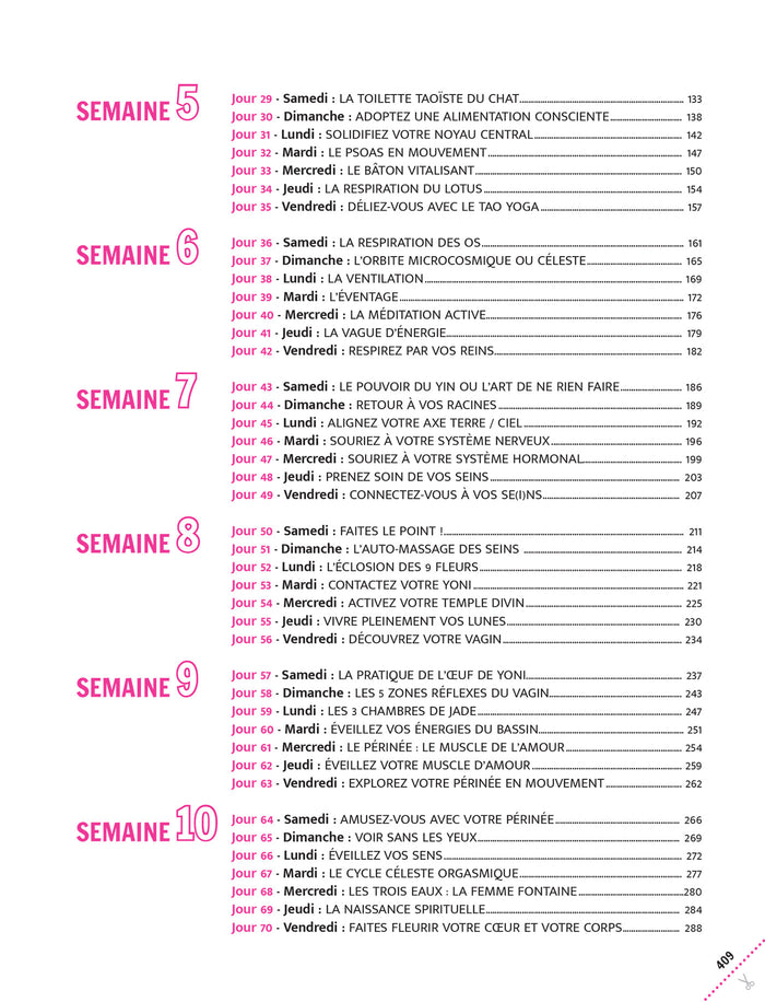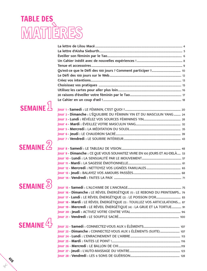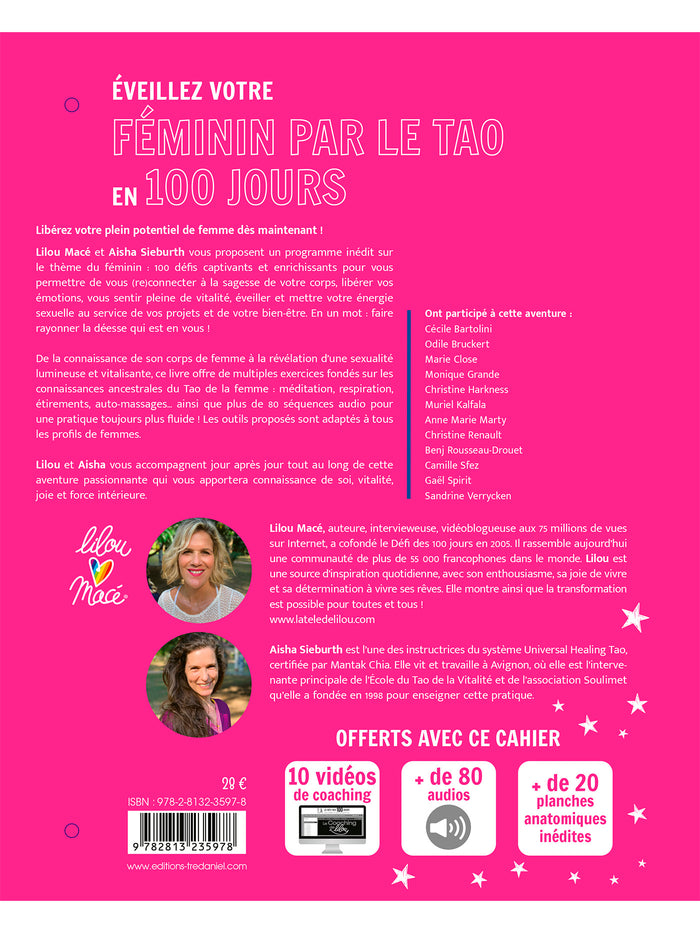 Note biographique Lilou Macéest auteure, vidéo-blogueuse et intervieweuse aux 110 millions de vues sur Internet. Vous pouvez la suivre sur : www.lateledelilou.com et www.defides100jours.com Aisha Sieburthest l'une des instructrices du Healing Tao System, certifiée par Maître Mantak Chia. Elle vit et travaille à Avignon, où elle est l'intervenante principale de l'École du Tao de la Vitalité et de l'association Soulimet qu'elle a fondée en 1998 pour concilier les approches orientales et occidentales des arts ancestraux de la guérison. ,PrésentationNouvelle édition d'un best-seller de la collection! Lilou Macé et Aisha Sieburth proposent un programme inédit sur le thème du féminin abordé sous le prisme des principes taoïstes : 100 jours pour se (re)connecter à la sagesse de son corps, libérer ses émotions, se sentir pleine de vitalité, éveiller et mettre son énergie sexuelle au service de ses projets et de son bien-être. Libérez votre plein potentiel de femme dès maintenant ! Lilou Macé et Aisha Sieburth vous proposent un programme inédit sur le thème du féminin : 100 défis captivants et enrichissants pour vous permettre de vous (re)connecter à la sagesse de votre corps, libérer vos émotions, vous sentir pleine de vitalité, éveiller et mettre votre énergie sexuelle au service de vos projets et de votre bien-être. En un mot faire rayonner la déesse qui est en vous ! De la connaissance de son corps de femme à la révélation d'une sexualité lumineuse et vitalisante, ce livre offre de multiples exercices fondés sur les connaissances ancestrales du Tao de la femme : méditation, respiration, étirements, auto-massages... ainsi que plus de 80 séquences audio pour une pratique toujours plus fluide ! Les outils proposés sont adaptés à tous les profils de femmes. Lilou et Aisha vous accompagnent jour après jour tout au long de cette aventure passionnante qui vous apportera connaissance de soi, vitalité, joie et force intérieure. Afficher moinsAfficher plus
