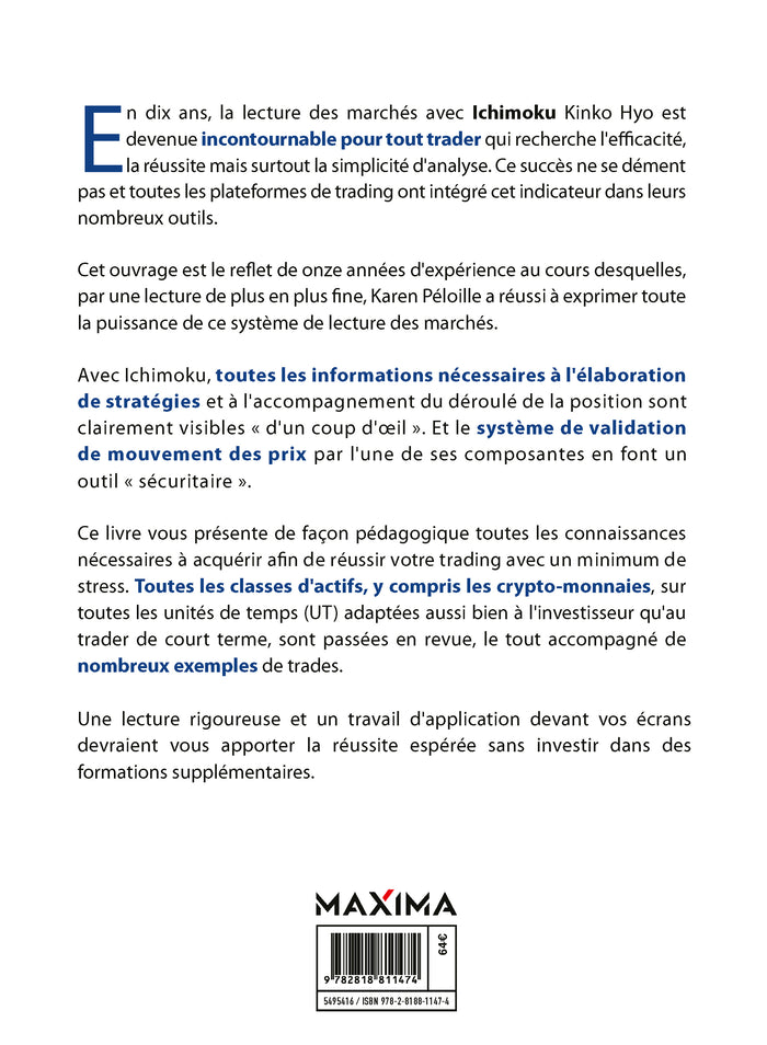 Le livre "Guide complet du trading avec Ichimoku" de Karen Péloille est une référence dans le domaine du trading. L'auteure partage son expertise acquise en onze années d'expérience avec l'indicateur Ichimoku Kinko Hyo. Cet ouvrage pédagogique couvre l'utilisation de cet indicateur sur toutes les classes d'actifs, y compris les crypto-monnaies, et sur toutes les unités de temps. À travers de nombreux exemples de trades, les lecteurs apprendront à élaborer des stratégies de trading efficaces et à gérer leurs positions en toute sécurité. Un livre incontournable pour les traders en quête de succès et de simplicité. Afficher moinsAfficher plus