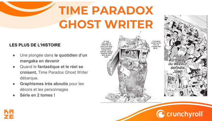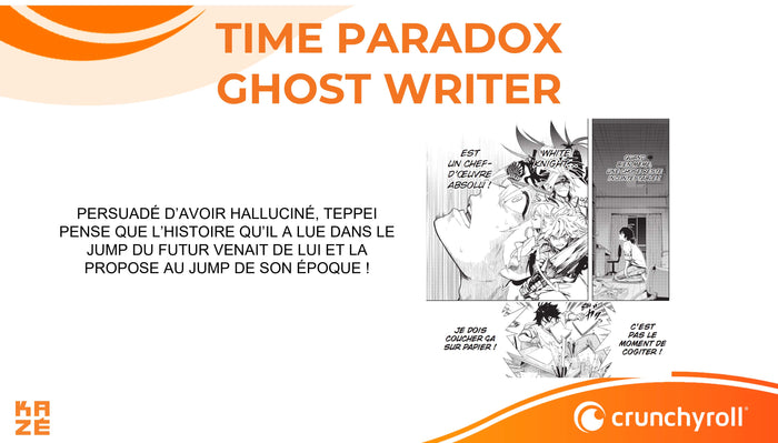 Dans ce premier tome de Time Paradox Ghost Writer, découvrez l'histoire de Teppei Sasaki, un jeune mangaka en herbe en proie au désespoir face aux refus successifs de ses œuvres. Sa vie bascule lorsqu'il trouve dans son micro-ondes un exemplaire du Weekly Shônen Jump... en provenance de 10 ans dans le futur ! Il y découvre une série à succès qu'il décide de recopier, mais bientôt, le véritable auteur, un mystérieux fantôme, apparaît et exige de collaborer. Teppei se retrouve plongé dans un dilemme entre la gloire et l'éthique, tandis que des forces surnaturelles semblent être à l'œuvre. Entre suspense, action et questionnements moraux, ce shonen original vous entraîne dans une intrigue palpitante au cœur du monde du manga. Afficher moinsAfficher plus