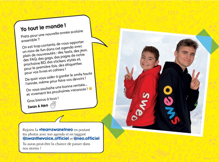 PrésentationUn agenda inédit pour tous les fans de Swan&Néo ! Swan& Néo t'invitent à vivre une année 100% fun grâce à leur nouvel agenda. Cette année, découvre un max de surprises : des gags, des illustrations inédites, des jeux, des tests, et des stickers ! L'agenda parfait pour passer l'année avec tes YouTubeurs préférés ! Afficher moinsAfficher plus