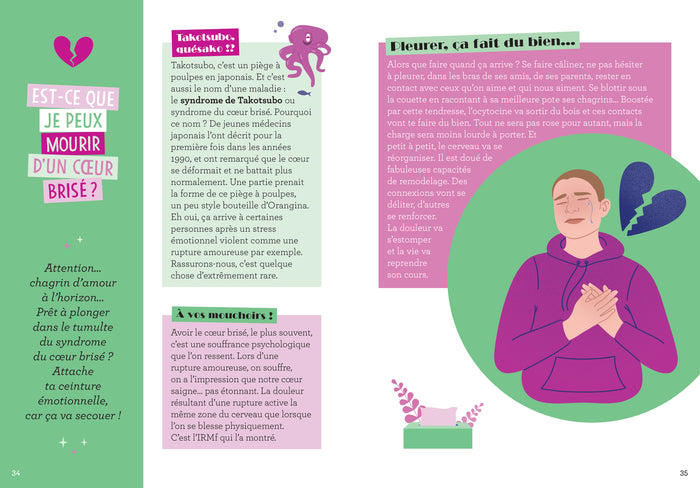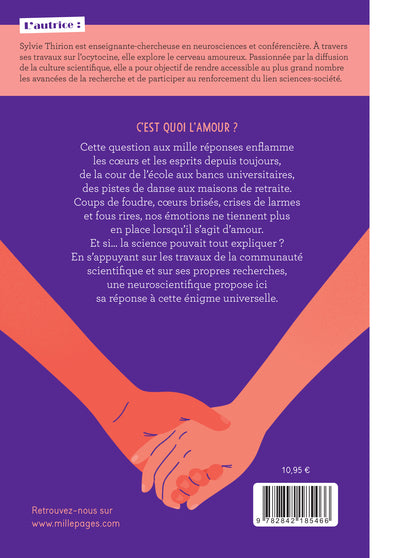 En bref Un documentaire illustré pour les adolescentsà partir de 12 ans qui se questionnent sur l’amour (causes de son apparition ou disparition, effets sur le corps et le comportement, etc.),écrit par une neuroscientifique spécialiste du sujet. ,Présentation Un documentaire illustré pour les adolescentsà partir de 12 ans qui se questionnent sur l’amour (causes de son apparition ou disparition, effets sur le corps et le comportement, etc.),écrit par une neuroscientifique spécialiste du sujet. C'est quoi l'amour ?Cette question aux mille réponses enflamme les cœurs et les esprits depuis toujours, de la cour de l'école aux bancs universitaires, des pistes de danse aux maisons de retraite. Coups de foudre, cœurs brisés, crises de larmes et fous rires, nos émotions ne tiennent plus en place lorsqu'il s'agit d'amour. Et si… la science pouvait tout expliquer ? En s'appuyant sur les travaux de la communauté scientifique et sur ses propres recherches, une neuroscientifique propose ici sa réponse à cette énigme universelle. Afficher moinsAfficher plus