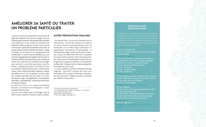 PrésentationEspaces de recueillement, d’étude et de méditation, les ashrams sont des lieux de retraite spirituelle. Ils intéressent de plus en plus l’Occident en tant que lieux ouvertsà chacun,à la mesure de sa quête de paix intérieure. Ce sont aussi des lieux privilégiés pour expérimenter un mode de vie en communauté et intrinsèquement durable. De l’immense diversité des cinquante ashrams qu’elle a visités, Yael Bloch a choisi de vous présenter en détail les plus représentatifs selon quatre critères principaux : le maître spirituel, l’orientation philosophique et spirituelle, les conditions d’accueil et la pratique du yoga postural. Un livre indispensable pour découvrir le monde passionnant des ashrams indiens et remonter aux sources du yoga.  Afficher moinsAfficher plus