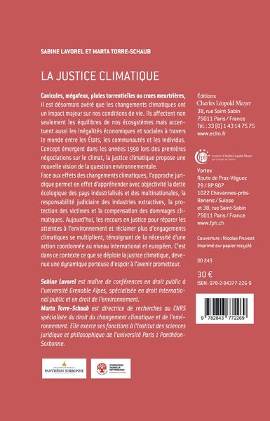 PrésentationLes changements climatiques affectent désormais la globalité de la population mondiale ainsi que nos équilibres écosystémiques, l'agriculture, la pêche, la forêt, les sols, la biodiversité, mais également nos systèmes financiers, assurantiels, pouvant bouleverser nos modes de vie. Les scientifiques s'accordent à dire qu'à l'avenir, les changements climatiques ne feront qu'accentuer les inégalités économiques et sociales d'ores et déjà observées entre États, communautés, catégories sociales, hommes et femmes, etc. Dans ce contexte, la justice climatique est devenue une question incontournable dans les débats nationaux et internationaux sur le climat. Afficher moinsAfficher plus