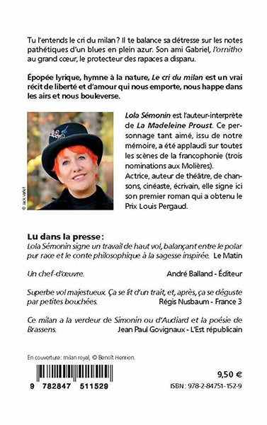 PrésentationTu l'entends le cri du milan ? Il te balance sa détresse sur les notes pathétiques d'un blues en plein azur. son ami Gabriel l'ornitho au grand coeur, le protecteur des rapaces a disparu. Epopée lyrique, hymne à la nature, le cri du milan est un vrai récit de liberté et d'amour qui nous emporte, nous happe dans les airs et nous boulverse. Afficher moinsAfficher plus