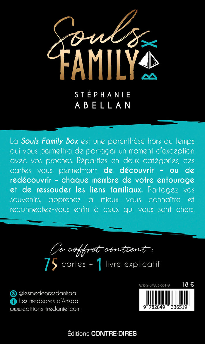 Présentation75 cartes pour tisser ou resserrer les liens familiaux. LaSouls Family Boxest une parenthèse hors du temps qui vous permettra de partager un moment d'exception avec vos proches. Réparties en deux catégories, ces cartes vous permettront de découvrir – ou redécouvir – chaque membre de votre entourage et de ressouder les liens familiaux. Partagez vos souvenirs, apprenez à mieux vous connaître et reconnectez-vous enfin à ceux qui vous sont chers. ,Note biographique Stéphanie Abellans'est toujours intéressée à la spiritualité et au développement personnel. Depuis dix ans, tout son travail de thérapeute est axé sur la libération et le nettoyage de la mémoire cellulaire. Créatrice des bijoux medeores, elle propose ses soins ainsi que de nombreux outils thérapeutiques de développement personnel sur son site :www.lesmedeoresdankaa.fr. Elle est également l'auteure du célèbre guide d'éveilKarma Bitchet deL'Oracle d'Ankaa, parus au Courrier du Livre, mais aussi deL'Oracle des Medeores, paru aux éditions Exergue, et de laGood Karma BoxetGood Quantic Box, parues aux éditions Contre-Dires. Afficher moinsAfficher plus