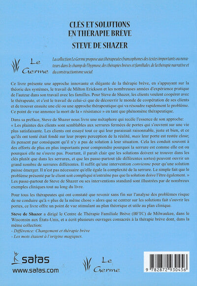 PrésentationCe livre présente une approche innovante et élégante de la thérapie brève, en s'appuyant sur la théorie des systèmes, le travail de Milton Erickson et les nombreuses années d'expérience pratique de l'auteur dans son travail avec les familles. Pour Steve de Shazer, les clients veulent coopérer avec le thérapeute, et c'est le travail de celui-ci que de découvrir le mode de coopération de ses clients et de trouver ensuite une clé ou une approche thérapeutique qui va résoudre rapidement le problème. Ce point de vue annonce la mort de la "résistance" en tant que phénomène thérapeutique. Dans sa préface, Steve de Shazer nous livre une métaphore qui recèle l'essence de son approche : "Les plaintes des clients sont semblables aux serrures fermées de portes qui s'ouvrent sur une vie plus satisfaisante. Les clients ont essayé tout ce qui leur paraissait raisonnable, juste et bien, et ce qu'ils ont tenté était fondé sur leur propre perception de la réalité, mais leur porte es restée close ; ils pensent par conséquent qu'il n'y a pas de solution à leur situation. Cela les conduit souvent à des efforts de plus en plus importants pour comprendre pourquoi la serrure est comme elle est ou pourquoi elle ne s'ouvre pas. Pourtant, il paraît clair que les solutions doivent se trouver dans les clés plutôt que dans les serrures, et que les passe-partout (de différentes sortes) peuvent ouvrir un grand nombre de serrures différentes. Il suffit qu'une intervention convienne pour qu'une solution puisse émerger. Il n'est pas nécessaire qu'elle égale la complexité de la serrure. Le simple fait que le problème présenté par le client soit compliqué n'entraîne pas que la solution doive l'être également." Les passe-partout de Steve de Shazer ou ses interventions standard sont illustrées par de nombreux exemples cliniques tout au long du livre. Pour tous les thérapeutes qui ont constaté que revenir sans fin sur l'analyse des problèmes risque de ne conduire qu'à " plus de la même chose " alors que se centrer sur les solutions fait s'ouvrir les portes, ce livre offre un point de vue stimulant au plan théorique et utile au plan clinique. Steve de Shazer est le directeur du Centre de Thérapie Familiale Brève (BFTC) de Milwaukee, dans le Wisconsin aux Etats-Unis, et a écrit plusieurs ouvrages consacrés à la thérapie brève dont, dans la même collection : - Différence : Changement et thérapie brève - Les mots étaient à l'origine magiques. Afficher moinsAfficher plus