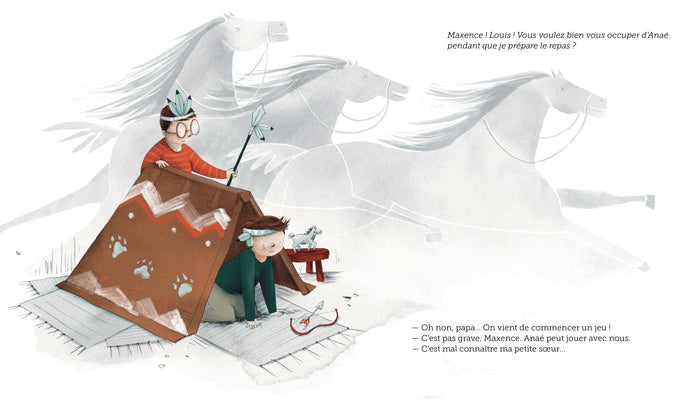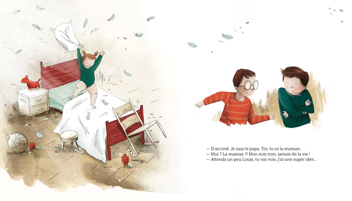 Note biographique Mathilde Perrault-Archambaultest née à Montréal et a passé sa jeunesse à parcourir l'Amérique du Sud et l'Europe dans la valise de son papa diplomate. Elle a fini par poser ses valises à elle dans l'ancienne école d'un village près deLyon. C'est là, dans cette grande maison habitée de fantômes espiègles et de rires d'enfants, qu'elle écrit pour la jeunesse et pour le théâtre. Elle a remporté le concours des Ecrivain.es des IEG pour son roman "Même pas peur". Stefanieest née dans une petite ville deBelgiqueen 1987. Enfant, elle dessinait tout le temps, alors elle a décidé d'étudier l'illustration et la narration à la Luca School of Arts Brussels. Elle aime expérimenter des matériaux traditionnels, mais elle travaille aussi avec le numérique. Elle a toujours besoin d'une histoire ou d'un personnage pour dessiner : elle aime donner vie aux mots. ,PrésentationMaxence et Louis veulent jouer à papa et maman, mais qui fera la maman ? Et surtout comment on ressemble à une maman ? Et finalement deux papas c'est bien aussi non ? Les thèmes de l'homoparentalité et des stéréotypes de genre sont abordés en toute simplicité. Maxence et son copain Louis doivent garder Aglaë, la petite sœur de Maxence, pendant que son père cuisine le repas du soir. Avec Aglaë dans la chambre, impossible de jouer à quoi que ce soit alors Louis propose de jouer à papa et maman. Mais qui fera la maman ? Comment on ressemble à une maman ? Est-ce que c'est obligé de jouer avec une maman ? Deux papas c'est bien aussi non ? Un album pour se questionner en toute légèreté sur les modèles familiaux. Afficher moinsAfficher plus