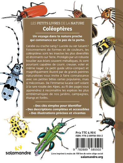 En bref Coccinelle, hanneton, capricorne… Les coléoptères sont les insectes les plus diversifiés sur Terre. Partezà la découverte des espèces les plus emblématiques et spectaculaires grâceà ce petit livre ultra-compact et magnifiquement illustré. ,Présentation Coccinelle, hanneton, capricorne… Les coléoptères sont les insectes les plus diversifiés sur Terre. Partezà la découverte des espèces les plus emblématiques et spectaculaires grâceà ce petit livre ultra-compact et magnifiquement illustré. Un voyage haut en couleur dans l’univers des insectes les plus cuirassés Carabes, scarabées, longicornes et autres cétoines : tout le monde connaît ces noms, mais presque personne ne sait reconnaître les animaux qui les portent. Tous appartiennent à l’immense ordre des coléoptères, qui regroupe près de 400 000 espèces dans le monde, un record parmi les insectes. Protégés par une robuste armure métallique, ces six-pattes prodigieux sont capables de courir, de voler et même de nager. Ce nouveau petit livre de la nature vous prend par la main pour identifier les espèces de coléoptères les plus communes ou emblématiques de nos régions, que ce soit au jardin, en forêt ou au bord de l’eau. Ses pages superbement illustrées expliquent leur mode de vie, indiquent où les observer et révèlent leurs particularités les plus insolites. Ouvrez donc ce petit guide et faites le premier pas tout en légèreté pour partir sur les traces de ces petites bêtes colorées et fort surprenantes. Afficher moinsAfficher plus