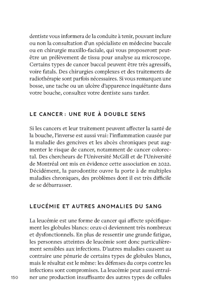 PrésentationComprendre les liens entre la santé buccale et la santé globale ! Ce livre accessible et imagé, rédigé dans une perspective de prévention, traite des enjeux de santé bucco-dentaire , caries, gencives douloureuses, dents cassées, inflammation qui affectent à peu près tout le monde. Bien que l'impact de ces problèmes sur la santé globale soit encore méconnu du grand public, la science sait maintenant que la santé du corps dans son ensemble est influencée par l'état de la bouche et des dents. En effet, alors que l'on vit plus vieux et que l'on garde nos dents plus longtemps, comprendre les liens entre le développement de problèmes de santé (maladies cardiovasculaires, diabète, etc.) et la condition des dents et de la bouche est devenu incontournable. ,Note biographique Après avoir complété un doctorat en médecine dentaire en 2002,Angèle Germaina pratiqué en cabinet privé et en milieu hospitalier pendant deux décennies. À la suite de son passage à l'Institut universitaire de cardiologie et de pneumologie de Québec, elle a entamé en 2021 une maîtrise en Santé publique, au cours de laquelle elle a pu développer ses compétences en recherche et en vulgarisation scientifique. Afficher moinsAfficher plus
