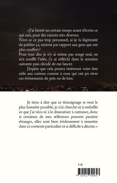 PrésentationTémoignage d'un Toulousain présent le soir du 13 novembre au Bataclan. « J’ai hésité un certain temps avant d’écrire ce qui suit, pour des raisons très diverses. N’est-ce ce pas trop personnel, ai-je la légitimité de publier ça, surtout par rapport aux gens qui ont plus souffert ? Pour tout dire je n’y ai même pas songé seul, on m’a soufflé l’idée, j’y ai réfléchi dans la semaine suivante puis décidé de me lancer. J’espère que cela pourra intéresser voire être utile aux curieux comme à ceux qui ont pu vivre ces évènements de près ou de loin. Je tiens à dire que ce témoignage se veut le plus honnête possible, je n’ai cherché ni à embellir ce que j’ai vécu ni à le dramatiser à outrance, donc si certaines de mes réflexions peuvent paraître étranges, elles sont bien évidemment à remettre dans ce contexte particulier et si difficile à décrire. » Afficher moinsAfficher plus