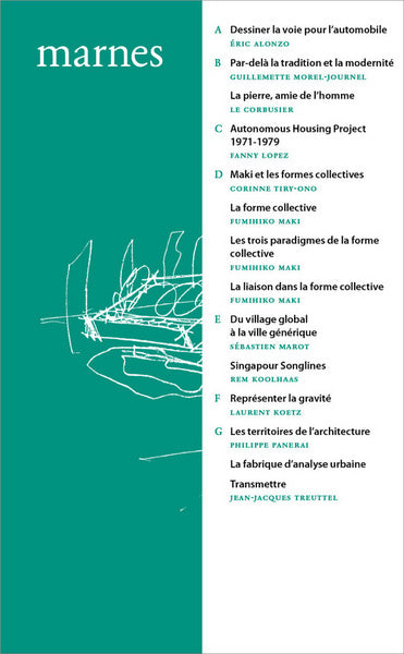 Présentation marnes, Documents d'architecture n°2 Sébastien Marot, Eric Alonzo, (dir.) Ce deuxième volume de marnes contient les premières traductions françaises de " Singapour Songlines " de Rem Koolhaas - l'article le plus volumineux de l'ouvrage S, M, L, XL -, les essais de Fumihiko Maki de 1964 sur les " formes collectives ", ainsi qu'un texte inédit de Le Corbusier sur l'usage de la pierre en architecture (1937). Y figurent également des articles d'Éric Alonzo, Laurent Koetz, Fanny Lopez, Sébastien Marot, Guillemette Morel-Journel, Philippe Panerai, Corinne Tiry-Ono et Jean-Jacques Treuttel sur l'art de dessiner les voies pour l'automobile, la maison autonome imaginée par Alexander Pike dans les années 1970, l'architectonique de deux maisons d'Eduardo Souto de Moura, l'enseignement de l'analyse urbaine dans les écoles d'architecture, etc. Marnes, documents d'architecture est produit par l'École d'architecture de la ville& des territoires à Marne-la-Vallée. Auteurs : Éric Alonzo, Le Corbusier, Laurent Koetz, Rem Koolhaas, Fanny Lopez, Fumihiko Maki, Sebastien Marot, Guillemette Morel-Journel, Philippe Panerai, Corrine Tiry-Ono, Jean-Jacques Treuttel Afficher moinsAfficher plus