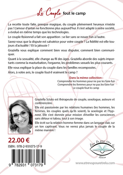 PrésentationLa recette toute faite, presque magique, du couple pleinement heureux n'existe pas ! L'amour d'antan ne fonctionne plus aujourd'hui. Il s'est adapté à notre société, a évolué en même temps que les technologies.Le couple fissionnel a fait son apparition : se lier sans se nouer l'un à l'autre.Savez-vous que la dispute est salvatrice pour votre couple ? La fidélité est-elle toujours d'actualité ? Et la jalousie ?Graziella vous explique comment bien vous disputer, comment bien communiquer.Quant à la sexualité, elle change au fil des âges. Graziella aborde des sujets importants comme la masturbation, l'orgasme, les problèmes sexuels les plus courants.Elle vous explique la place du couple dans les familles recomposées.Alors, à votre avis, le couple fout-il vraiment le camp ? Afficher moinsAfficher plus