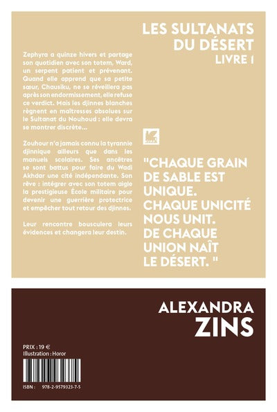 PrésentationZephyra a quinze hivers et partage son quotidien avec son totem Ward, un serpent patient et prévenant. Quand elle apprend que sa petite soeur, Chausiku, ne se réveillera pas après son endormissement, elle refuse ce verdict. Mais les djinnes blanches règnent en maîtresses absolues sur le Sultanat du Nouhoud : elle devra se montrer discrète...<br /> Zouhour n’a jamais connu la tyrannie djinnique ailleurs que dans les manuels scolaires. Ses ancêtres se sont battus pour faire du Wadi Akhdar une cité indépendante. Son rêve : intégrer avec son totem aigle la prestigieuseÉcole militaire pour devenir une guerrière protectrice et empêcher tout retour des djinnes.<br /> Leur rencontre bousculera leurs évidences et changera leur destin. Afficher moinsAfficher plus