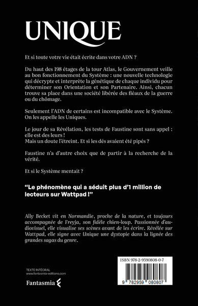 PrésentationEt si toute votre vie était écrite dans votre ADN ?Du haut des 198 étages de la tour Atlas, le Gouvernement veille au bon fonctionnement du Système : une nouvelle technologie qui décrypte et interprète la génétique de chaque individu pour déterminer son Orientation et son Partenaire. Ainsi, chacun trouve sa place dans une société libérée des fléaux de la guerre ou du chômage. Seulement l’ADN de certains est incompatible avec le Système. On les appelle les Uniques.Le jour de sa Révélation, les tests de Faustine sont sans appel : elle est des leurs ! Mais un doute l’étreint. Et si les dés avaient été pipés ? Faustine n’a d’autre choix que de partir à la recherche de la vérité.Et si le Système mentait ? Afficher moinsAfficher plus