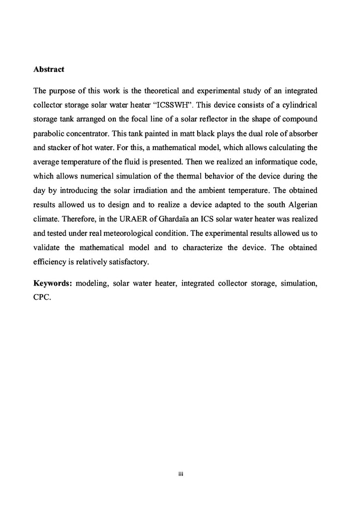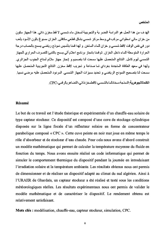 Ce livre présente une étude théorique et expérimentale d'un chauffe-eau solaire de type capteur stockeur, composé d'une cuve de stockage cylindrique sur la ligne focale d'un réflecteur solaire en forme de concentrateur parabolique composé. Les auteurs ont développé un modèle mathématique pour calculer la température du fluide, ainsi qu'un code informatique pour simuler le comportement thermique du dispositif. Ils ont ensuite dimensionné et testé le dispositif en conditions réelles, obtenant des résultats satisfaisants. Cette étude a été menée à l'URAER de Ghardaïa, en Algérie. Afficher moinsAfficher plus
