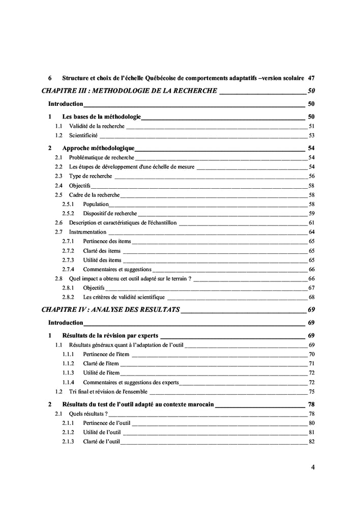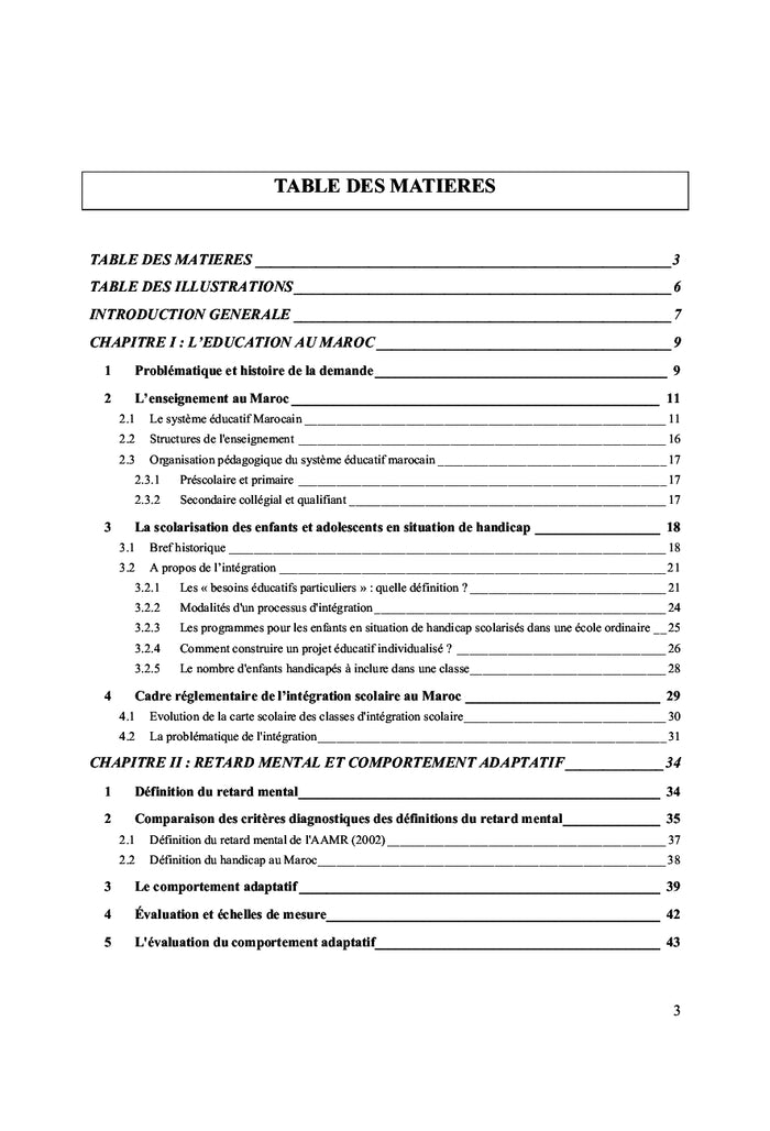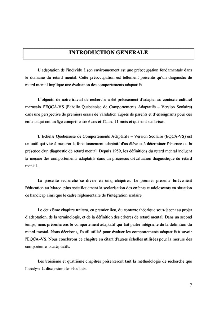 PrésentationL'adaptation de l'individu à son environnement est une préoccupation fondamentale dans le domaine du retard mental. Cette préoccupation est tellement présente qu'un diagnostic de retard mental implique une évaluation des comportements adaptatifs. L'objectif de ce travail de recherche a été précisément d'adapter au contexte culturel marocain l'EQCA-VS (Echelle Québécoise de Comportements Adaptatifs - Version Scolaire) dans une perspective de premiers essais de validation auprès de parents et d'enseignants pour des enfants qui ont un âge compris entre 6 ans et 12 ans 11 mois et qui sont scolarisés. L'Echelle Québécoise de Comportements Adaptatifs- Version Scolaire (ÉQCA-VS) est un outil qui vise à mesurer le fonctionnement adaptatif d'un élève et à déterminer l'absence ou la présence d'un diagnostic de retard mental. Depuis 1959, les définitions du retard mental incluent la mesure des comportements adaptatifs dans un processus d'évaluation diagnostique du retard mental. Afficher moinsAfficher plus