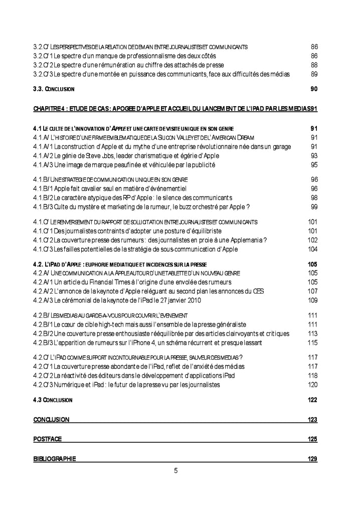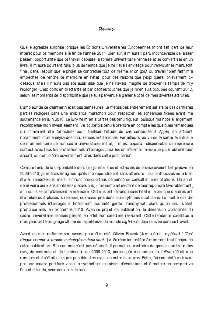 PrésentationCet ouvrage s'intéresse aux relations presse dans le secteur high-tech, à l'heure où les médias sont confrontés à des mutations inexorables de leur modèle économique et des pratiques professionnelles. Cette analyse de la conversion au numérique des entreprises de presse repose sur les visions croisées de journalistes et de communicants. Elle est enrichie d'une étude de cas dédiée à l'iPad d'Apple, dont l'annonce en janvier 2010 est intervenue après des mois de rumeurs. L'occasion de décrypter la stratégie de communication unique en son genre de la firme de Cupertino. Cette exception a bouleversé les rouages du rapport de sollicitation des faiseurs d'information par leurs sources, mis en évidence dans les premiers chapitres. La couverture presse enthousiaste dont a bénéficié cette tablette tactile fait écho aux tâtonnements et aux incertitudes du champ médiatique. Initialement rédigé en 2010 dans le cadre du master 1 journalisme de Sciences Po Rennes, sous la direction de Roselyne Ringoot, ce mémoire est complétée d'une préface et d'une postface visant à mettre en perspective l'objet d'étude avec trois ans de recul. Afficher moinsAfficher plus