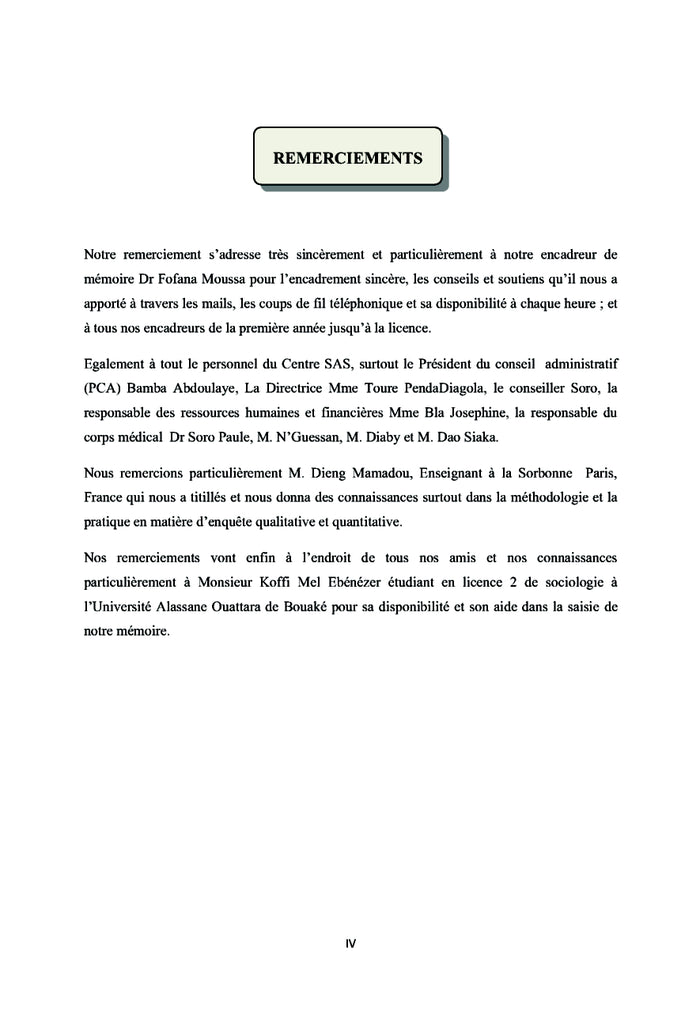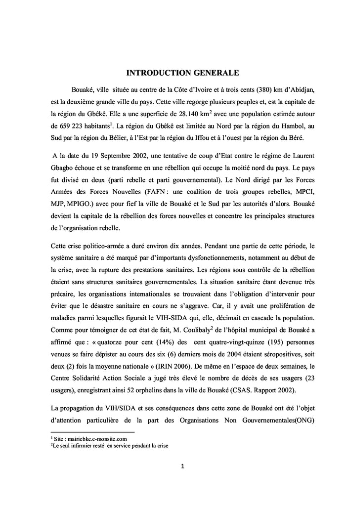PrésentationPendant la crise armée qu'a connue la Côte d'Ivoire, depuis le 19 septembre 2002, avec pour conséquence l'absence de toutes les structures sanitaires à Bouaké, l'ONG CSAS n'a pas sombré bien qu'impactée considérablement. Au contraire, elle a survécu et est passée de la prise en charge psychosociale à la prise en charge globale. Ce document est lerésultat des recherches que nous avons effectuées en trois mois (juin, juillet et août). Cette oeuvre constitue une vérification de la méthodologie en sciences sociales apprise pendant nos trois années d'étude. Il s'agit concrètement de l'application de la méthodologie sociologique à un fait social. Ainsi, le sujet de cette vérification est intitulé de la manière suivante : la lutte contre le VIH/SIDA en situation de crise armée : l'expérience du CSAS de Bouaké. Afficher moinsAfficher plus