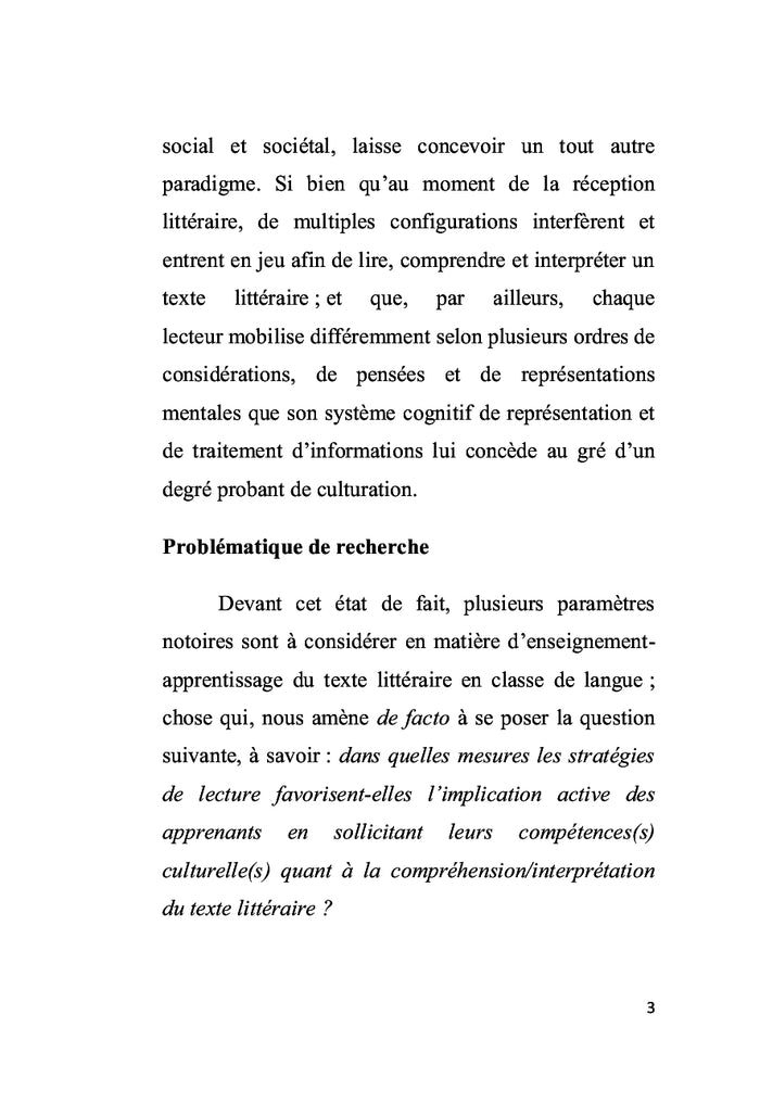 Dans cette ère de mondialisation, l'identité et la culture de l'individu sont des enjeux majeurs en didactique des langues-cultures. Cette étude explore les approches culturelles des apprenants de FLE face aux textes littéraires, mettant en lumière une nouvelle compétence transculturelle. Réalisée dans différents contextes culturels, elle vise à observer cette dimension culturelle émergente en classe, souvent négligée par les programmes officiels. Afficher moinsAfficher plus