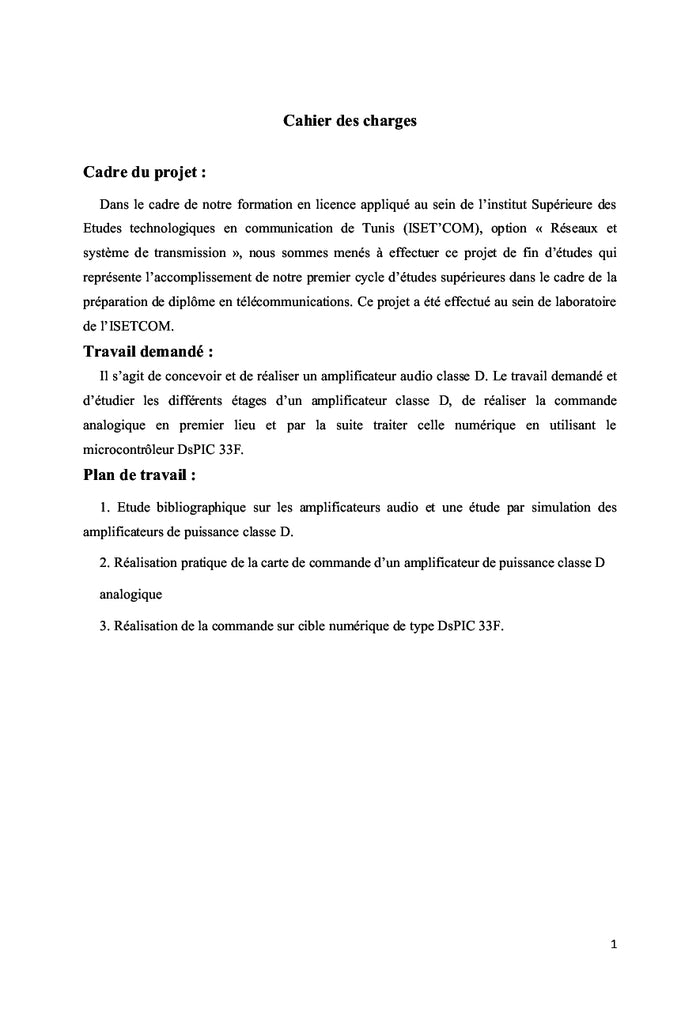 PrésentationDans ce travail j'ai ètudié et réalisè une carte de commande d'amplificateur classe D.D'abord une ètude théorique et stumilation de cette classe d' amplificateur est faite.Puis j'ai réalisé la carte de commande analogique qui comporte l'étage de la modulation de largeur d'impulsion.Enfin j'ai l'implèmentè sur cible numèrique qui est la carte dsPic 33F.Mots clés : MLI (modulation de largeur d'impulsion) , amplificateur de puissance. Afficher moinsAfficher plus