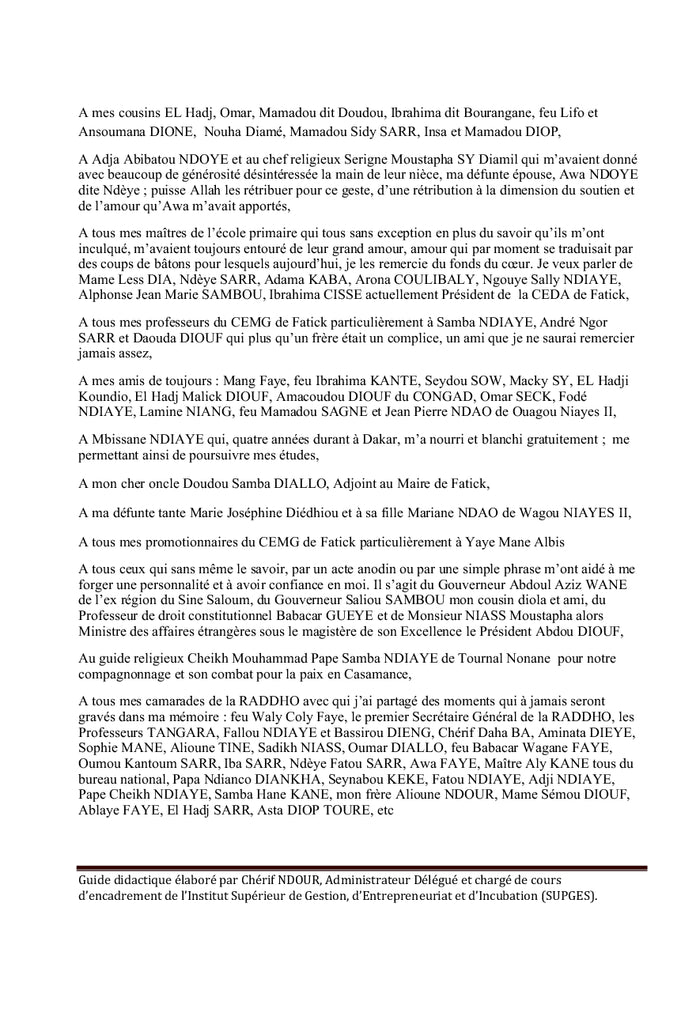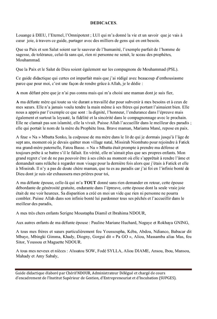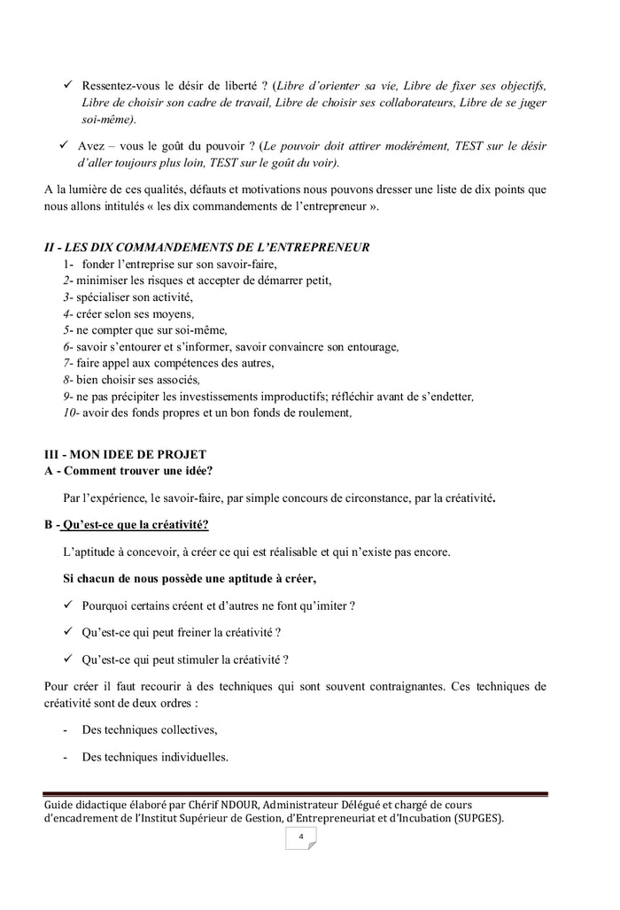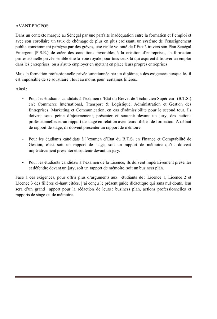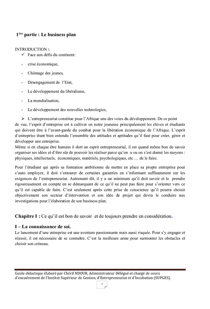 PrésentationUn travail intellectuel n'étant jamais achevé, ce guide est ouvert et incite les utilisateurs à l'enrichir au fur et à mesure de sa pratique.Il comprend quatre parties respectivement consacrées :- Au business plan,- A la méthodologie de rédaction d'une action professionnelle,- A la méthodologie de rédaction d'un rapport de stage,- A la méthodologie de rédaction d'un rapport de mémoire.Conçu essentiellement pour les étudiants de 1ère, 2ème et 3ème année de licence des écoles de formation professionnelle et de façon générale pour tous ceux qui voudraient s'initier à l'élaboration de projets de création d'entreprise, plus qu'un guide mémoire, ce document aide le futur entrepreneur, avant de se lancer dans une quelconque activité entrepreneuriale, à faire son introspection, son auto évaluation pour savoir dans quel secteur d'activités, dans quelle activité il se sentirait le plus à l'aise pour entreprendre. Afficher moinsAfficher plus