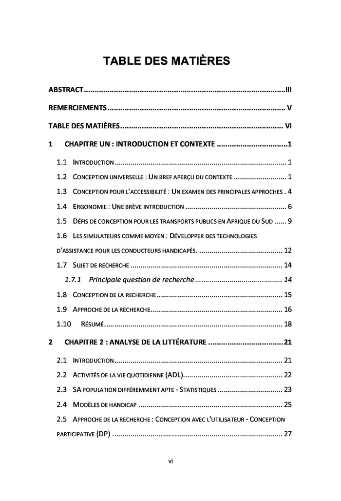 PrésentationLes simulateurs sont utilisés à des fins très diverses, notamment pour la réadaptation physique et la formation d'apprentis conducteurs aux capacités différentes. En Afrique du Sud, cependant, ce dernier type de simulateurs est réservé aux apprentis-conducteurs paraplégiques. La raison en est que l'approvisionnement local de l'équipement nécessaire pour adapter les simulateurs commerciaux à la formation d'apprentis conducteurs différemment valides pose un problème. Le concept de conception universelle stipule que le plus grand nombre possible d'individus doit pouvoir utiliser un produit particulier. Par conséquent, un simulateur destiné aux apprentis conducteurs handicapés devrait pouvoir accueillir le plus grand nombre possible de ces personnes. Toutefois, l'application de la conception universelle dans le domaine de la conception étudié dans le cadre du présent mémoire ajoute encore à la complexité en raison de la nature unique des limitations physiques que connaissent les individus. Un conducteur non handicapé impose une contrainte extrême à la conception d'un produit et devient un utilisateur limitatif. L'intelligence artificielle a été utilisée pour traduire ce livre. Afficher moinsAfficher plus