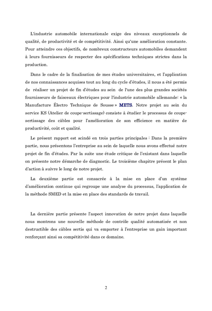 PrésentationPour éliminer les défaillances du processus coupe-sertissage, l'un des segments les plus importants de processus global de production, METS a décidé d'adopter une stratégie de réduction de temps d'arrêt machine et des défauts qualité. Ainsi, dans notre projet de fin d'études, nous avons suivi la démarche nécessaire pour renforcer cette stratégie. Nous avons fait en première étape un diagnostic dans l'atelier KS. Nous avons recueilli le maximum d'informations a fin de les filtrer et les évaluer pour dégager nos axes d'interventions En suite, nous avons élaboré un plan d'actions pour préparer l'installation du système et mettre fin, en même temps, aux défaillances enregistrées. Dans ce plan d'actions, nous avons utilisé un ensemble d'outils d'amélioration continue et de standardisation de processus. En plus nous avons proposé une alternative de système contrôle qualité basé sur la vision industrielle. Afficher moinsAfficher plus