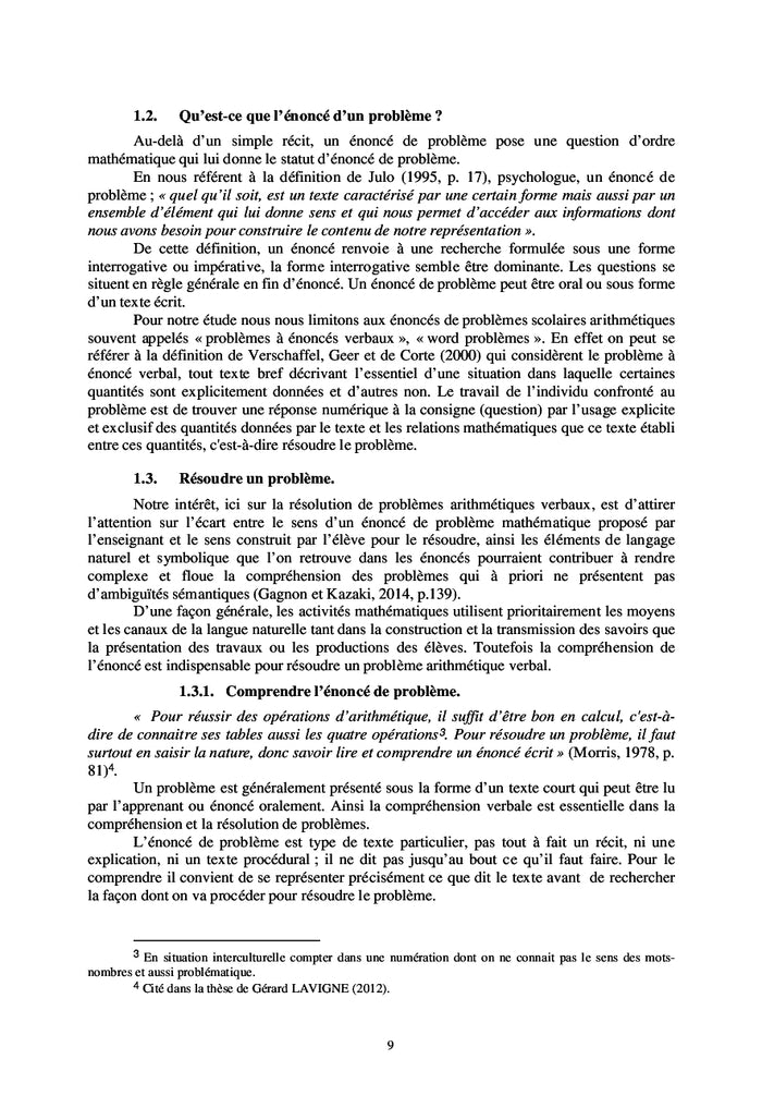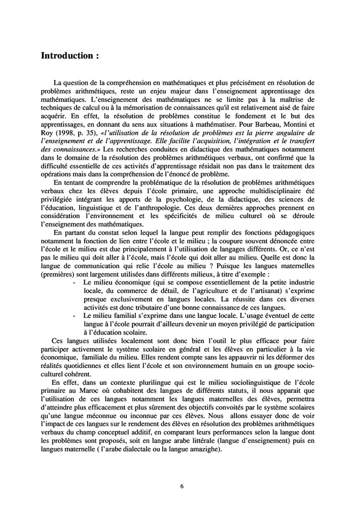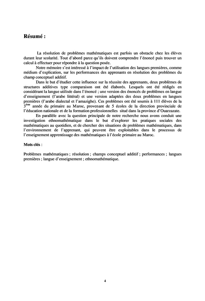 La résolution de problèmes mathématiques est parfois un obstacle chez les élèves durant leur scolarité. Tout d'abord parce qu'ils doivent comprendre l'énoncé puis trouver un calcul à effectuer pour répondre à la question posée. Notre mémoire s'est intéressé à l'impact de l'utilisation des langues premières, comme médium d'explication, sur les performances des apprenants en résolution des problèmes du champ conceptuel additif. Dans le but d'étudier cette influence sur la réussite des apprenants, deux problèmes de structures additives type comparaison ont été élaborés. Lesquels ont été rédigés en considérant la langue utilisée dans l'énoncé ; une version des énoncés de problèmes en langue d'enseignement (l'arabe littérale) et une version adaptée des deux problèmes en langues premières (l'arabe dialectale et l'amazighe). Ces problèmes ont été soumis à 111 élèves de la 3ème année du primaire au Maroc, provenant de 5 écoles de la direction provinciale de l'éducation nationale et de la formation professionnelle située dans la province d'Ouarzazate. Afficher moinsAfficher plus