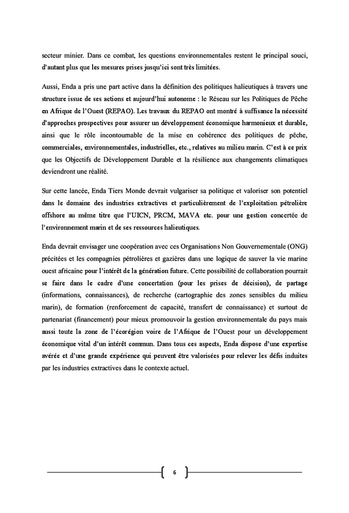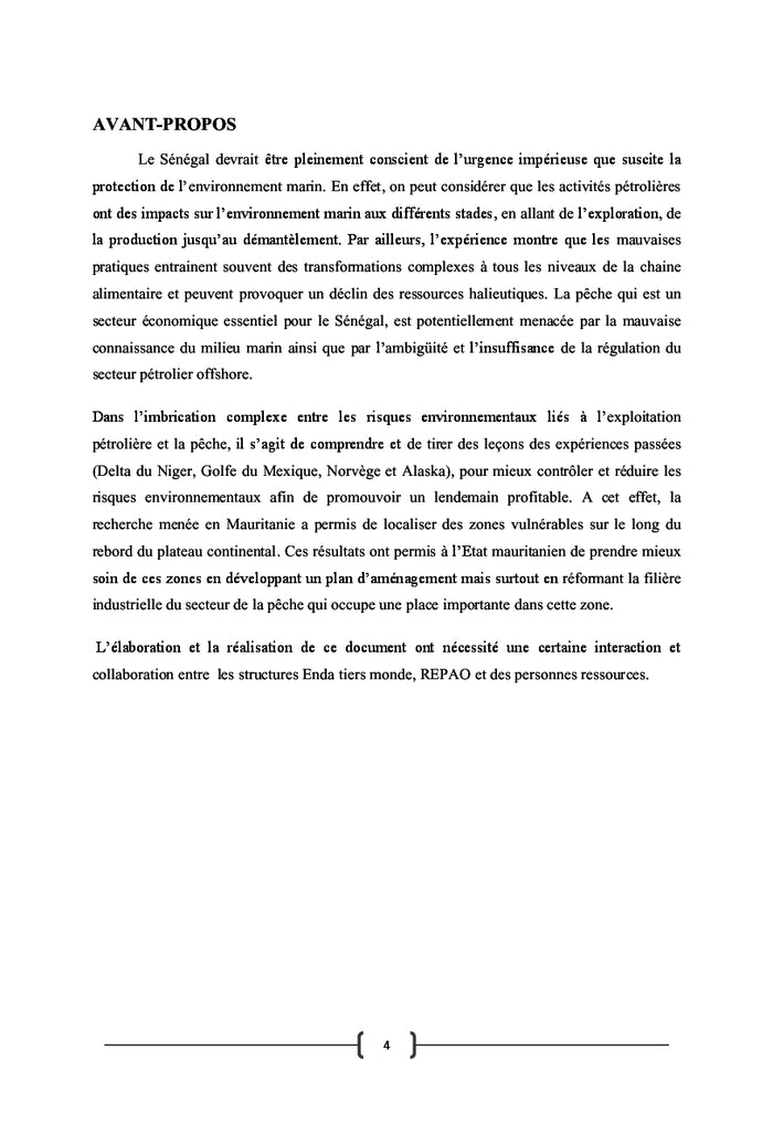 PrésentationLe plus grand risque environnemental de l'exploitation du pétrole offshore se situe dans l'amont pétrolier. C'est-à-dire l'étape à laquelle, le processus de recherche et d'extraction du pétrole brut se met en place. Mais il peut avoir moins d'impact si l'activité est bien encadrée et gérée. Dans le processus de l'exploitation pétrolière, les activités non réglementées peuvent à tout moment perturber les écosystèmes marins riches et sensibles ou fragiliser les activités de pêche dont dépendent les pêcheurs locaux. Cette récente découverte de pétrole dans le bloc de Sangomar offshore profond, arrive dans un contexte où la connaissance scientifique du milieu marin est très limitée. De même, la mise en place des dispositifs techniques pertinents pour la réduction de risque environnemental n'est pas encore au rendez-vous. Ceci étant dit que la capacité de l'Etat, à contrôler et à s'assurer de la gestion responsable de l'environnement, reste toujours faible. A cet effet, le risque des impacts négatifs sur la biodiversité marine dont dépend la pêche face au développement du projet pétrolier au large de la petite côte mérite une attention particulière de l'ensemble des parties prenantes. Afficher moinsAfficher plus
