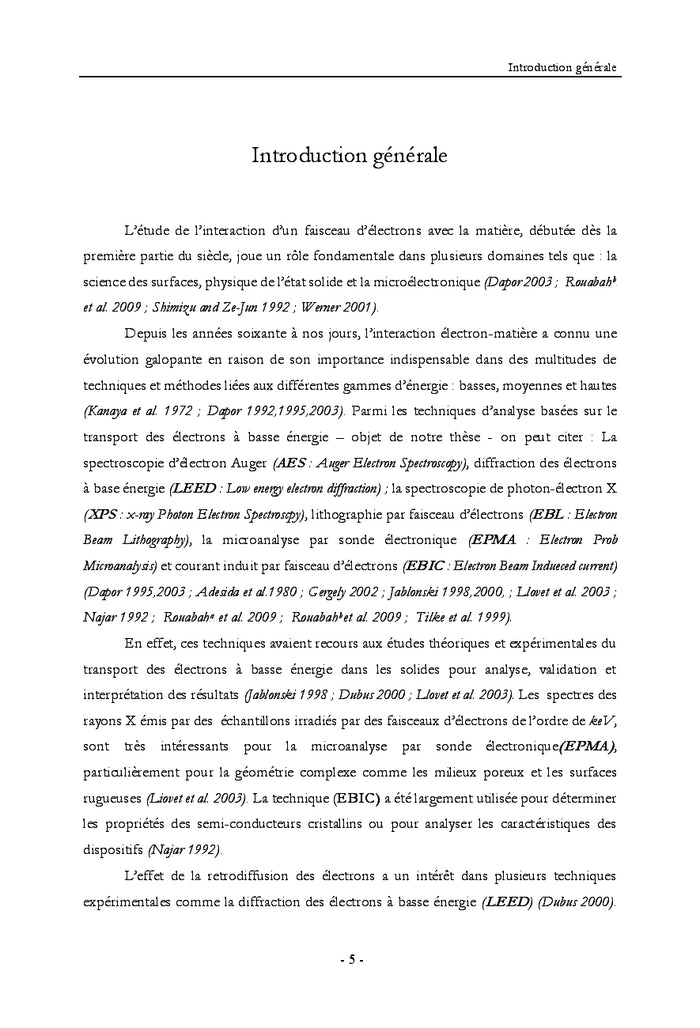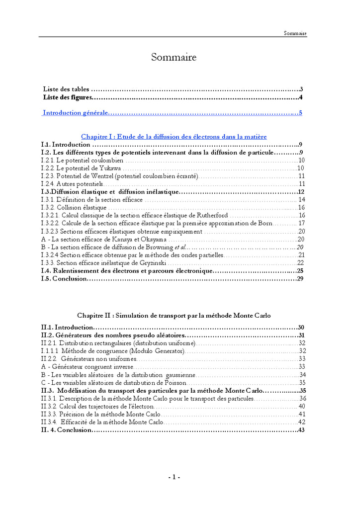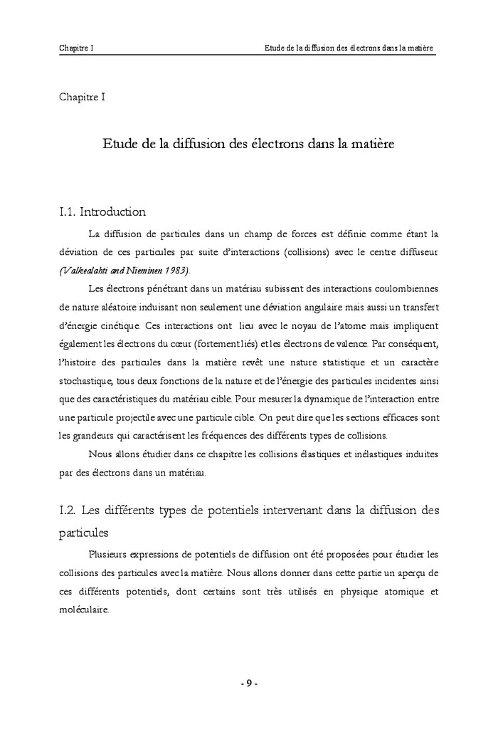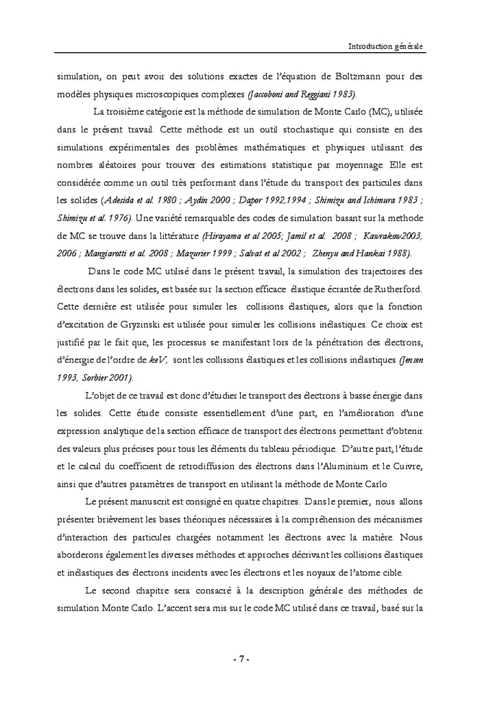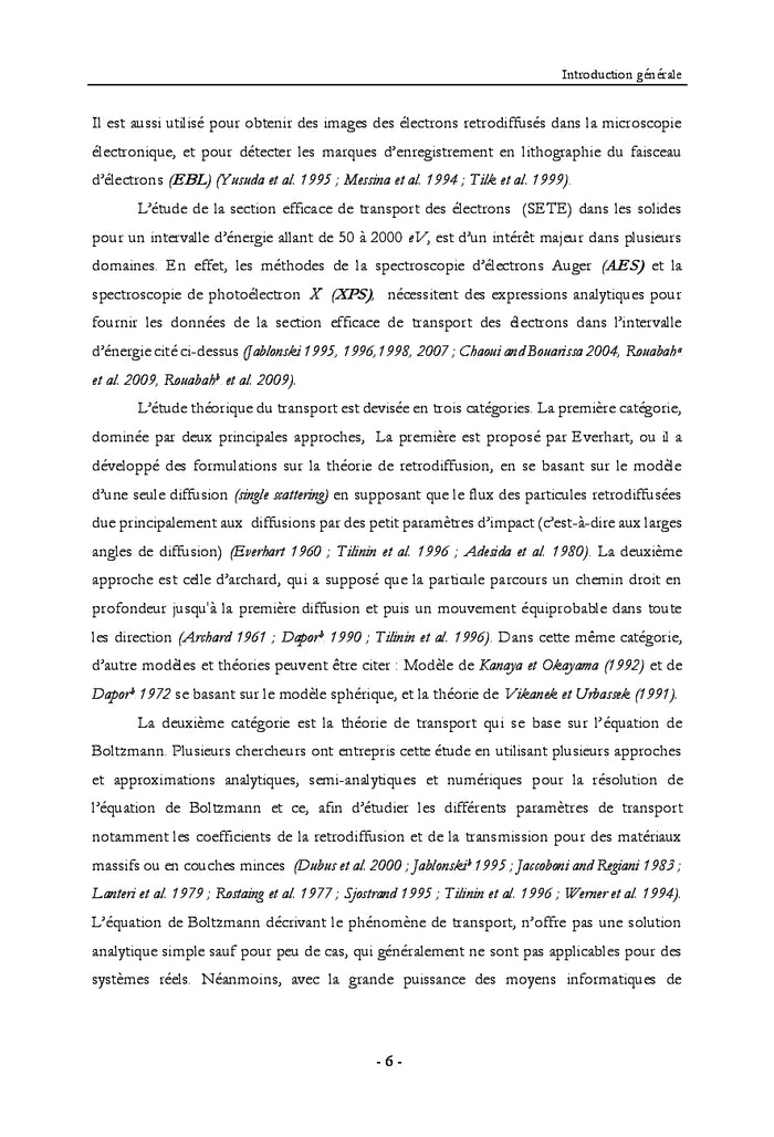 PrésentationLe présent manuscrit est consigné en quatre chapitres. Le premier chapitre présente, brièvement les bases théoriques nécessaires à la compréhension des mécanismes d'interaction des particules chargées notamment les électrons avec la matière ainsi que les diverses méthodes et approches décrivant les collisions élastiques et inélastiques des électrons incidents avec les électrons et les noyaux de l'atome cible. Le second chapitre est consacré à la description générale des méthodes de simulation Monte Carlo. L'accent est mis sur le code MC utilisé dans ce travail, basé sur la section efficace écrantée de Rutherford pour simuler les collisions élastiques et la fonction d'excitation de Gryzinski pour simuler les collisions inélastiques. Le troisième chapitre est consacré à la présentation des résultats concernant la première correction introduite sur la section efficace de transport dérivée par Jablonski (1998). En fin, dans le quatrième chapitre, une deuxième correction portée sur la section efficace de transport dérivée par Jablonski (1998) est présentée avec le calcul du coefficient de rétrodiffusion et la profondeur moyenne de pénétration des électrons dans quelques matériaux. Afficher moinsAfficher plus