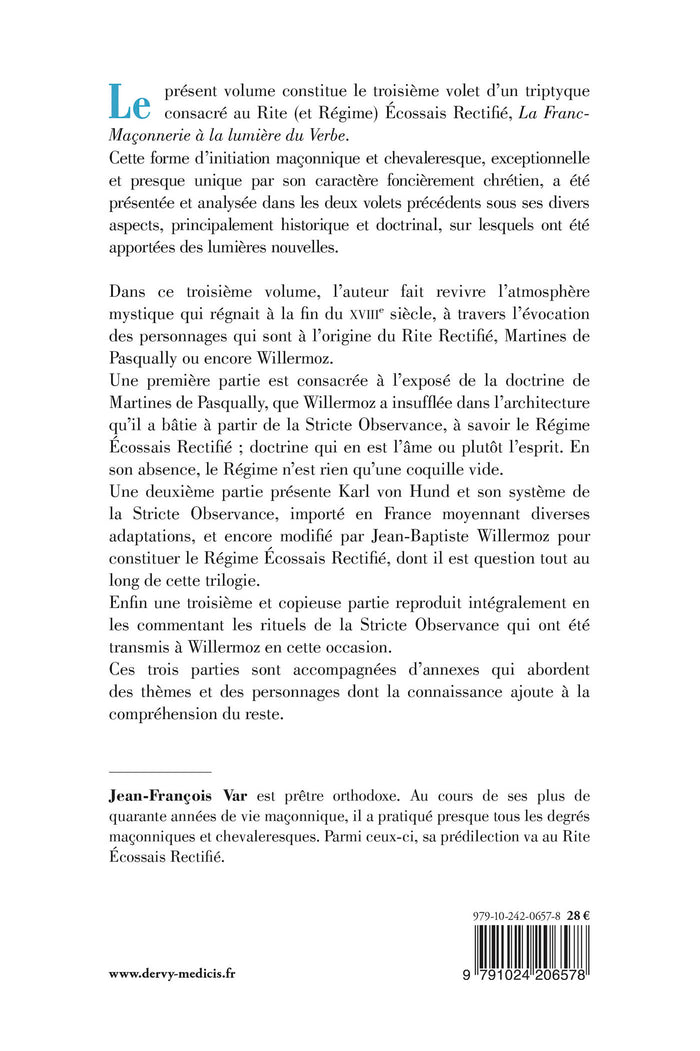 Dans ce troisième tome, l'auteur, Jean-François Var, prêtre orthodoxe et ancien élève de l'École Normale Supérieure, continue son exploration de la franc-maçonnerie à travers le prisme du Rite Écossais Rectifié. Il met en lumière l'atmosphère mystique du XVIIIe siècle en évoquant des figures clés telles que Martines de Pasqually et Willermoz, à l'origine de ce rite. Var partage ses réflexions sur l'initiation maçonnique et chevaleresque, imprégnée de valeurs chrétiennes, qu'il a expérimentée au fil de ses quarante années de pratique. Afficher moinsAfficher plus