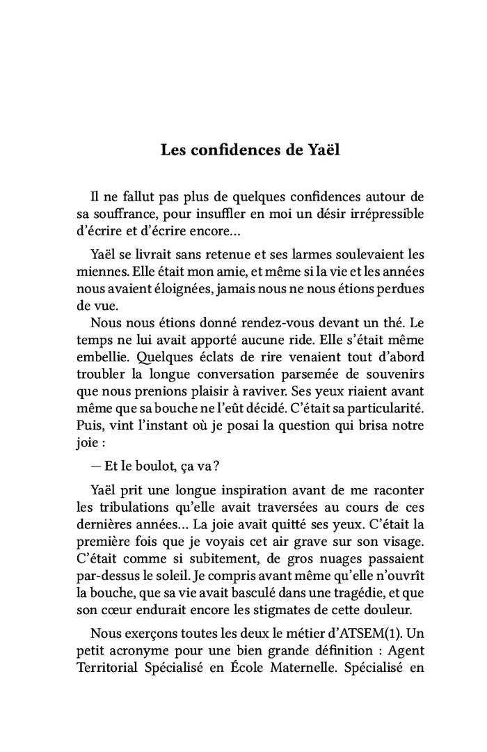 PrésentationMarie Grosset est Agent Territorial Spécialisé en École Maternelle (ATSEM). De sa plume sincère et touchante, elle raconte à travers le prisme de témoignages saisissants, la souffrance de ses collègues. Elle explique sans complaisance le pouvoir de leurs différentes hiérarchies qui souvent, les abîme, les maltraite, et les conduit parfois au pire. Avec toute sa sensibilité, elle évoque ses propres expériences, celle d'une maman essayant de protéger son fils contre la folie d'une enseignante, mais aussi, son parcours professionnel qui l'a emmenée un jour aux portes de la mort. Avec franchise et sans détour, elle décrit l'univers impitoyable dans lequel évoluent des petits enfants, dénonçant sans ambages les comportements inappropriés de certain(e)s enseignant(e)s à leur égard, leur manque de respect et les dérives journalières dont ils sont victimes. Il vous appartient de connaître la vérité sur leurs premières années de vie, même si l'Éducation Nationale couvre et protège trop souvent son élite. Marie prend à témoin chaque lecteur pour faire changer le monde : « Si je suis moi aussi un petit colibri de la légende, que dois-je encore accomplir pour avoir la certitude d'avoir fait ma part ? Je veux bien m'agenouiller devant vous et vous supplier de faire la vôtre ». Pour Marie et pour vous, rien ne pourra plus être comme avant, rien ne devra plus être comme avant, car après avoir lu ce livre bouleversant, vous saurez... L'auteure a décidé de briser l'Omerta. Afficher moinsAfficher plus