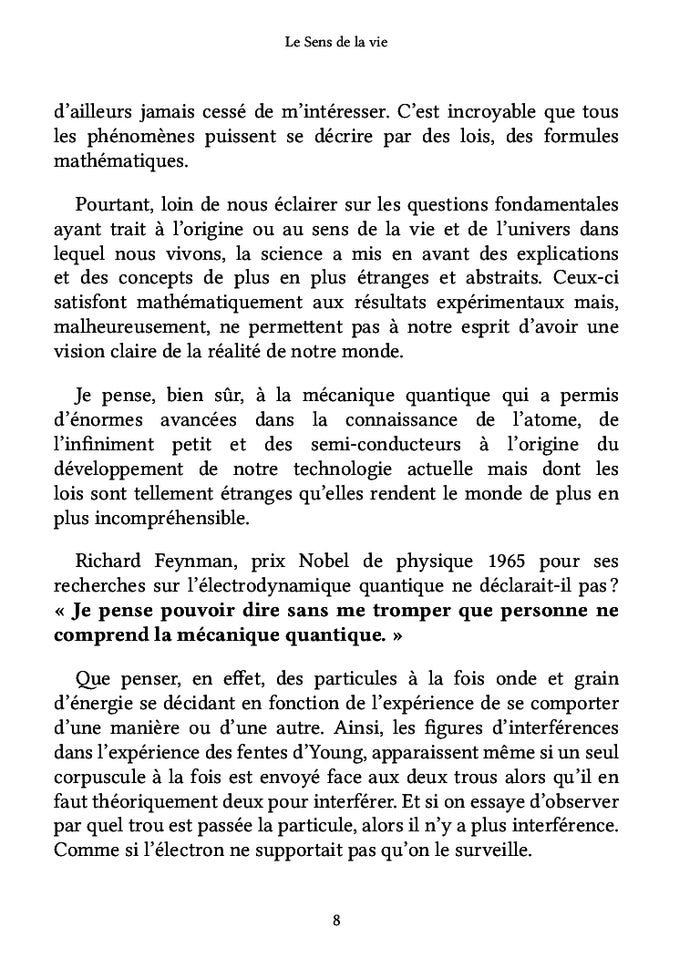 Dans ce court ouvrage, le physicien retraité René Cisamolo partage sa vision du sens de la vie, fruit de recherches scientifiques, philosophiques, théologiques et paranormales. Il s'appuie sur les travaux de grands penseurs pour aboutir à une conclusion universelle. L'auteur aborde la question existentielle fondamentale de la manière de mener une vie en accord avec la réalité du monde, en explorant les notions de bonheur, d'amour et de mort. Afficher moinsAfficher plus