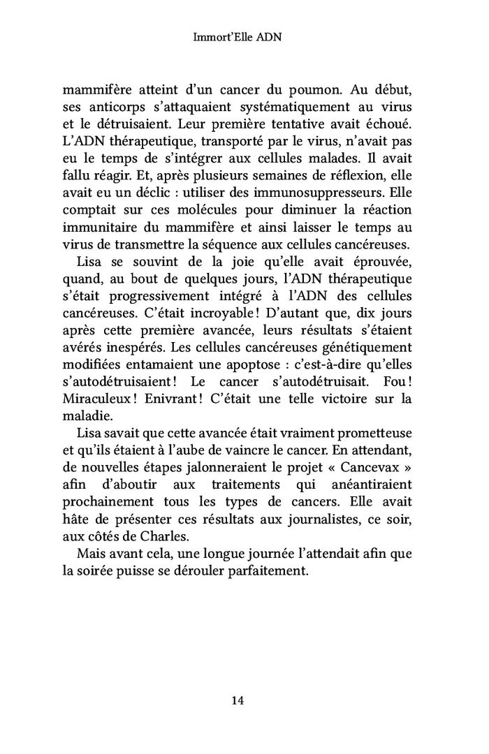 Vaincre le cancer... Un espoir fou ou bientôt une réalité ? Lisa Comrad est généticienne au sein de l'institut TecGenik à Paris. À 31 ans, elle dirige le projet « Cancevax » aux côtés de son confrère Charles Dens. Aujourd'hui, ils doivent présenter à la presse l'aboutissement de leurs recherches. Sauf que ce matin-là, l'impensable se produit. Subitement, Lisa se fige, tétanisée, puis se jette au sol : le laboratoire est attaqué ! Par qui ? Pourquoi ?
