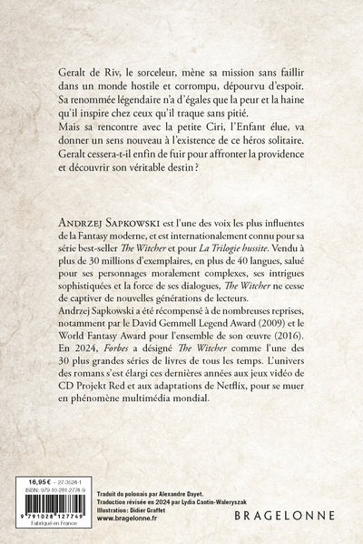 Dans ce deuxième tome des aventures du Sorceleur, Geralt de Riv poursuit sa mission de tueur de monstres dans un monde sombre et impitoyable. Sa rencontre avec la jeune Ciri, Enfant élue au destin mystérieux, bouleverse sa vie et l'entraîne dans des machinations plus grandes qu'eux. Entre politique, magie et dangers, Geralt devra affronter la providence et révéler son vrai destin. Pendant ce temps, une ancienne ennemie, la sorcière Vilgefortz, complote pour s'emparer de Ciri et utiliser son pouvoir à des fins maléfiques. Le Sorceleur devra faire des choix qui détermineront le sort du monde. Afficher moinsAfficher plus
