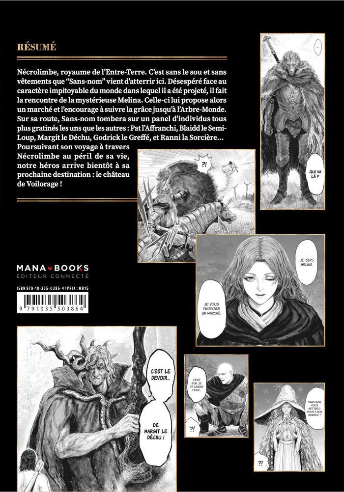 PrésentationSuivez les aventures loufoques de "Sans-Nom' en Entre-Terre ! Nécrolimbe, royaume de l'Entre-Terre. C'est sans le sou et sans vêtements que "Sans-nom' vient d'atterrir ici. Désespéré face au caractère impitoyable du monde dans lequel il a été projeté, il fait la rencontre de la mystérieuse Melina. Celle-ci lui propose alors un marché et l'encourage à suivre la grâce jusqu'à l'Arbre-Monde. Sur sa route, Sans-nom tombera sur un panel d'individus tous plus gratinés les uns que les autres : Pat l'Affranchi, Blaidd le Semi-Loup, Margit le Déchu, Godrick le Greffé, et Ranni la Sorcière... Poursuivant son voyage à travers Nécrolimbe au péril de sa vie, notre héros arrive bientôt à sa prochaine destination : le château de Voilorage ! Afficher moinsAfficher plus