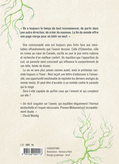 4e de couverture« On a toujours le temps de tout recommencer, de partir dans une autre direction, de créer du nouveau. La fin du monde offre une page vierge pour en bâtir un neuf. » Une communauté unie est toujours plus forte face aux inévitables effondrements que l'avenir dessine. Celle d'Edmonton, ville en ruines au cœur du Canada, oscille au jour le jour entre rudesse et recherche d'un meilleur confort. Un équilibre que l'apparition du cad, un parasite semi-conscient qui influence le comportement de son hôte, teinte de drame. La vie ne sera plus jamais comme avant, mais le printemps succède toujours à l'hiver : Reid reçoit une lettre d'admission à l'université, une opportunité inestimable de rejoindre les derniers vestiges du monde révolu. Et peut-être d'accéder à un remède contre le parasite qui la ronge. Sera-t-elle capable de quitter ceux qui l'aiment et qui comptent sur elle ? « Un récit singulier sur l'avenir, qui équilibre élégamment l'horreur existentielle et l'espoir nécessaire. Premee Mohamed est incroyablement douée. » — Chuck Wendig Afficher moinsAfficher plus