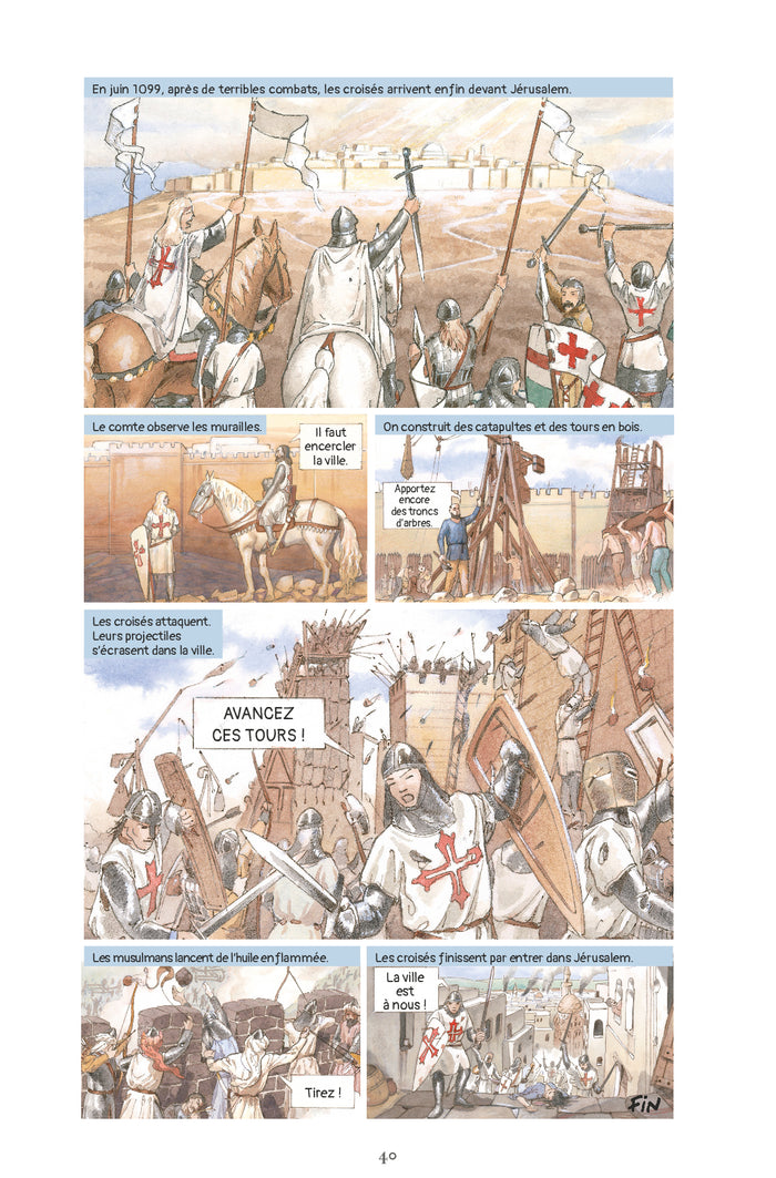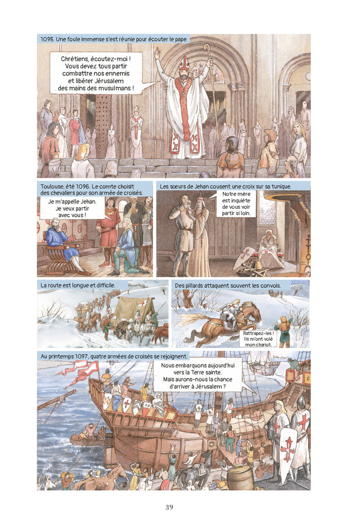 PrésentationLe Moyen Age en 16 BD et 30 pages documentaires : cet ouvrage parcourt les 1000 ans qu'a duré le Moyen Âge, du temps de Clovis, le premier roi chrétien, à celui de Jeanne d'Arc. Avec une grande chronologie illustrée pour se repérer dans le temps. Au fil des pages, les lecteurs font connaissance avec les personnages les plus marquants de ce millénaire, apprennent à connaître la structure de la société médiévale, visitent les seigneurs comme les paysans, partent en croisade ou à l'assaut d'un château fort... Les BD, conçues pour être accessibles aux enfants dès 8 ans, reproduisent fidèlement les éléments de l'épisode qu'elles décrivent. Les illustrations sont réalistes, réalisées par des dessinateurs de talent, avec un travail documentaire rigoureux. Les épisodes auxquels elles donnent vie sont travaillés dans un double objectif : être dynamiques et plaisants à lire tout en étant représentatifs du sujet qu'ils traitent. Chaque BD est complétée par des pages documentaires. Claires, aérées et illustrées, ces pages fournissent au lecteur un complément d'information : elles permettent de resituer la BD dans son contexte historique et de faire le lien entre les différents sujets abordés dans l'ouvrage. Afficher moinsAfficher plus