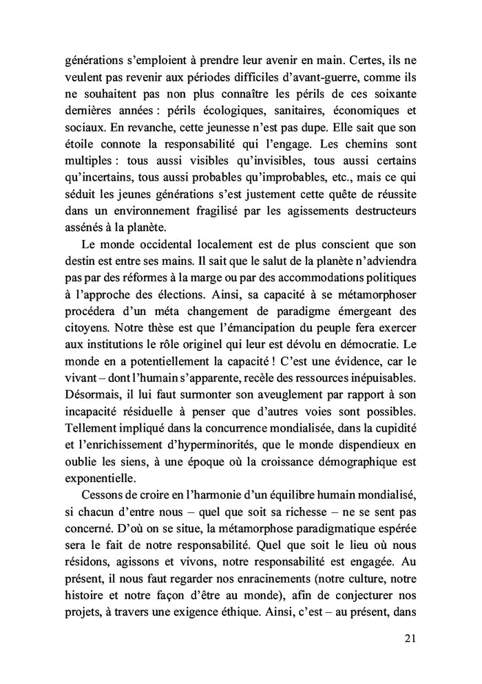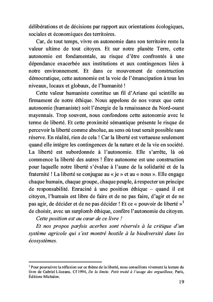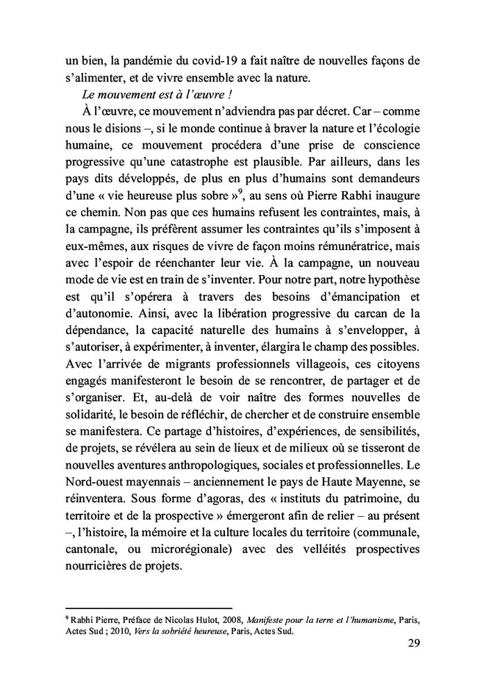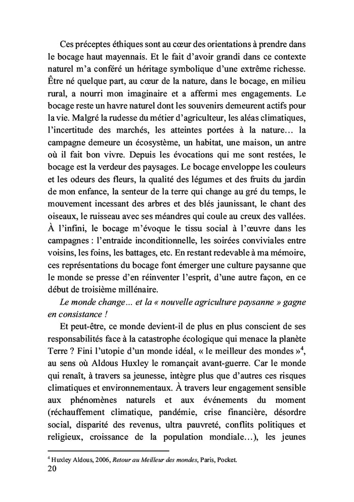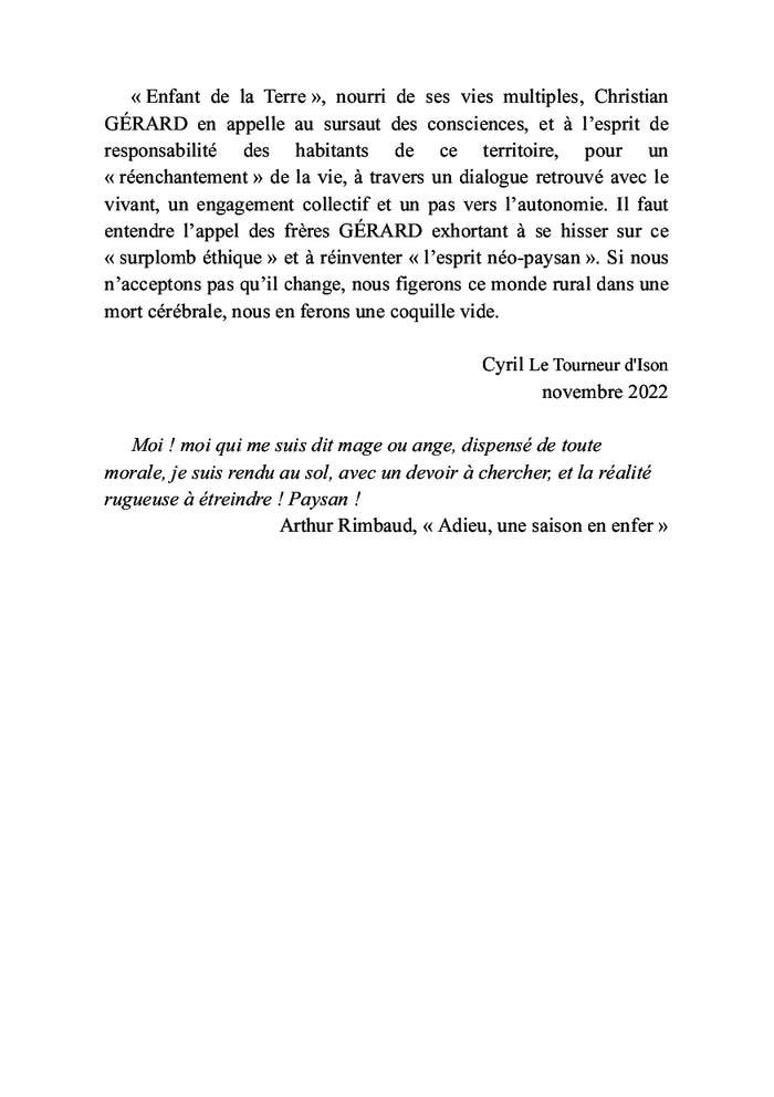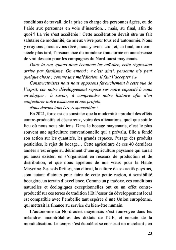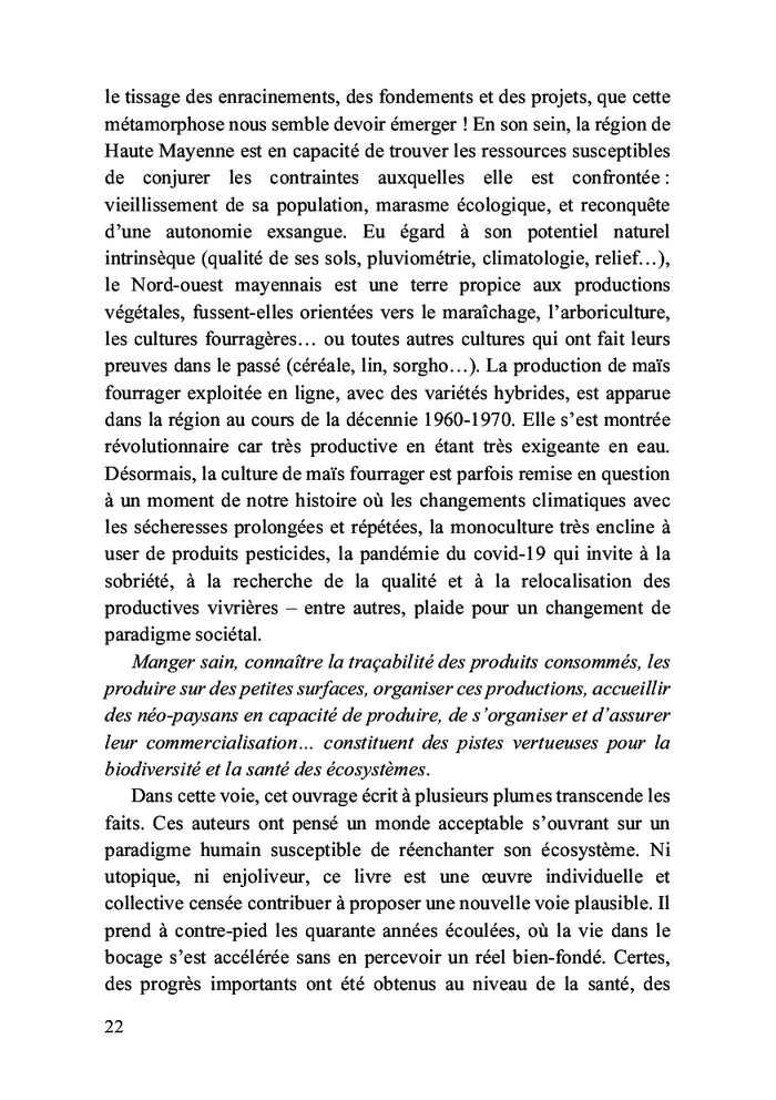 Ce livre se fait le chantre d'un espoir métissant la ruralité et l'urbanité. Au fil des lignes, Le bocage pour une agriculture paysanne se prête au jeu du réenchantement des campagnes par le biais d'une littérature plus poétique qui se déploierait entre fiction et réalité. Il propose de vraies perspectives pour le Nord-Ouest mayennais, au cœur des écosystèmes, autour du maraîchage et de l'agroécologie, également via l'engagement humain dans un nouveau paradigme.
