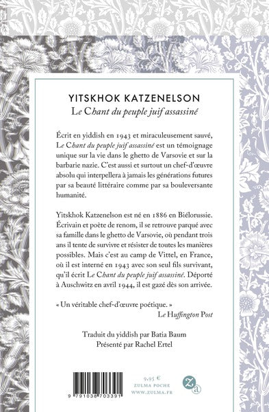 Ce magnifique poème narratif unique en son genre est la dernière et plus grande œuvre d’Yitskhok Katzenelson, écrit après trois ans de lutte dans le ghetto de Varsovie, après le meurtre de sa femme et ses enfants, après le transfert au camp de Vittel, antichambre de la mort. Si son Journal de Vittel réussit à sortir du camp, confié à une Française employée journalière, Le Chant du peuple juif assassiné ne nous est parvenu que grâce à la survie d’une autre détenue, en trois bouteilles scellées enterrées.
