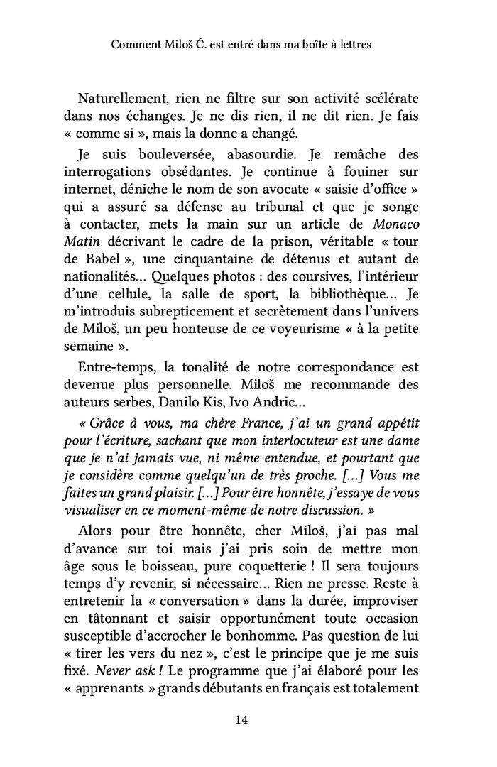 Dans ce récit, la journaliste Donna Alovesti relate sa correspondance avec Milos, un détenu serbe, qui souhaite apprendre le français. Ce qui débute comme une simple aide linguistique se transforme en une relation profonde, empreinte d'émotions et de tendresse. Leur échange épistolaire se poursuit sur plusieurs années, jusqu'à la libération de Milos en 2023. Malgré leur proximité, les deux protagonistes ne se sont jamais rencontrés en personne. Ce témoignage bouleversant aborde les thèmes de la rédemption, de l'amitié et de la communication à travers les frontières. Afficher moinsAfficher plus