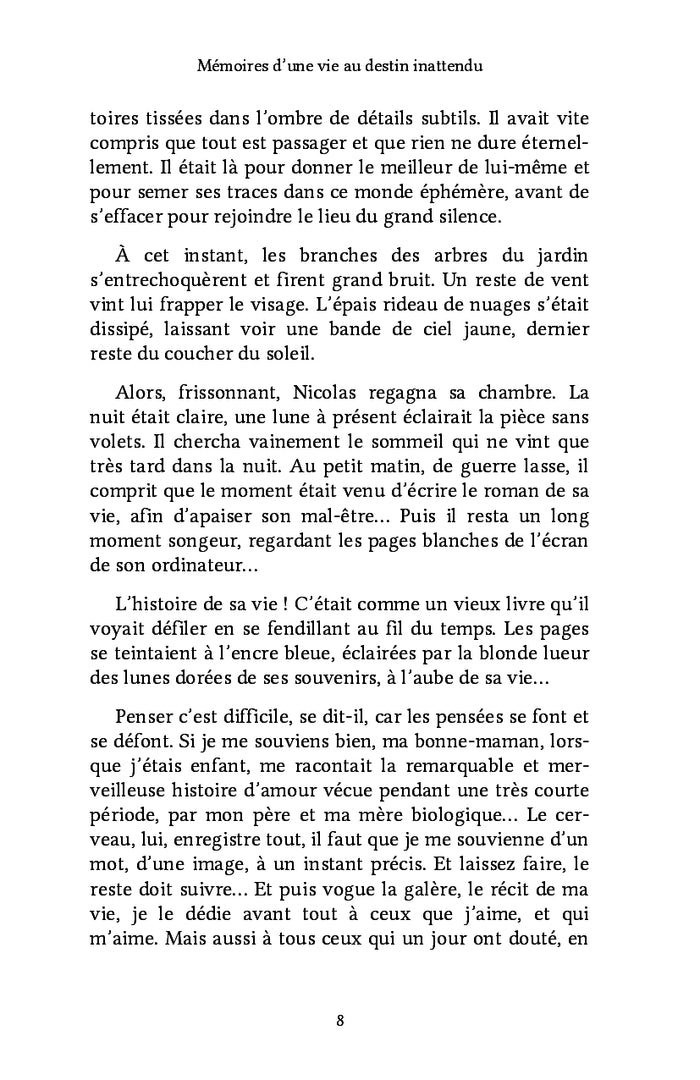 PrésentationÀ 77 ans, Nicolas est au crépuscule de sa vie. Très affecté par la disparition de sa compagne, il cède au désespoir et pense au pire, jusqu'au moment où son meilleur ami lui suggère d'écrire son histoire. Du château de son enfance à la guerre d'Algérie, de ses amours déçues à ses réussites professionnelles, le septuagénaire se remémore avec émotion les événements qui ont jalonné son existence et ont façonné celui qu'il est devenu. Le sort s'est acharné contre lui, mais le combat qu'il a mené jour après jour pour atteindre ses rêves n'en valait-il pas la peine ? Ce roman retrace l'étonnant parcours d'un homme courageux qui a toujours su rebondir face aux épreuves de la vie et qui a accueilli son destin avec résilience. Afficher moinsAfficher plus