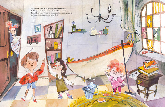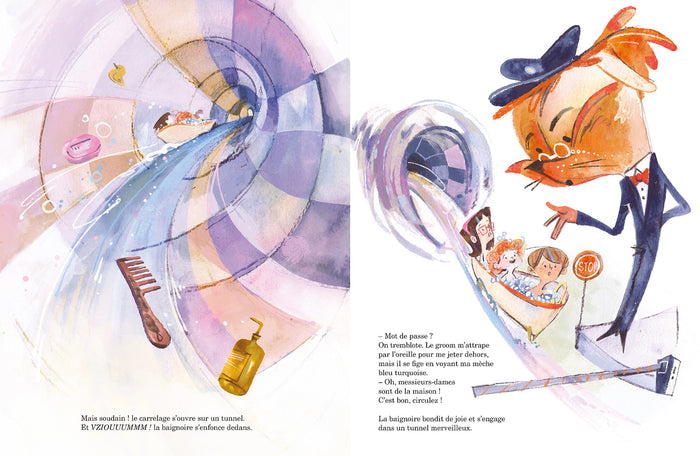 Robinson-polisson et ses soeurs Asphodèle et Vendémiaire débarquent avec leur mère désargentée dans une nouvelle maison toute pourrie. Pire : quand l'heure du bain arrive, il semble qu'en plus, la maison soit hantée ! La baignoire se cabre, les carreaux s'ouvrent sur un tunnel sans fond et vzioum ! les trois enfants sont précipités à bord de leur contenant rebelle dans un monde magique. Un petit génie scintillant, étrangement ressemblant à la photo de leur Mamie qu'ils n'ont jamais connue, leur apparaît alors...