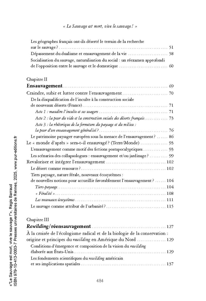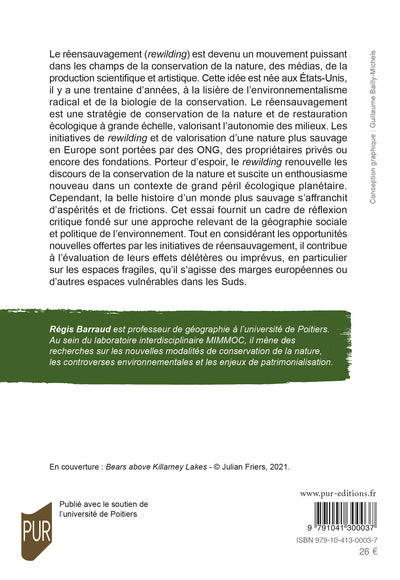 PrésentationLe réensauvagement (rewilding) est devenu un mouvement puissant dans les champs de la conservation de la nature, des médias, de la production scientifique et artistique. Cette idée est née aux États-Unis, il y a une trentaine d’années, à la lisière de l’environnementalisme radical et de la biologie de la conservation. Le réensauvagement est une stratégie de conservation de la nature et de restauration écologique à grande échelle, valorisant l’autonomie des milieux. Les initiatives derewildinget de valorisation d’une nature plus sauvage en Europe sont portées par des ONG, des propriétaires privés ou encore des fondations. Porteur d’espoir, lerewildingrenouvelle les discours de la conservation de la nature et suscite un enthousiasme nouveau dans un contexte de grand péril écologique planétaire. Cependant, la belle histoire d’un monde plus sauvage s’affranchit d’aspérités et de frictions. Cet essai fournit un cadre de réflexion critique fondé sur une approche relevant de la géographie sociale et politique de l’environnement. Tout en considérant les opportunités nouvelles offertes par les initiatives de réensauvagement, il contribue à l’évaluation de leurs effets délétères ou imprévus, en particulier sur les espaces fragiles, qu’il s’agisse des marges européennes ou d’autres espaces vulnérables dans les Suds. Afficher moinsAfficher plus