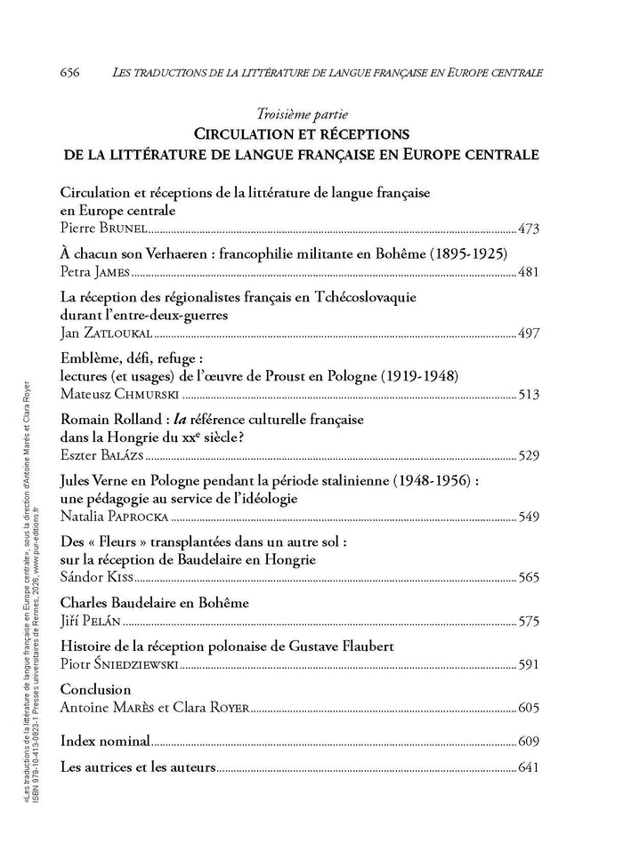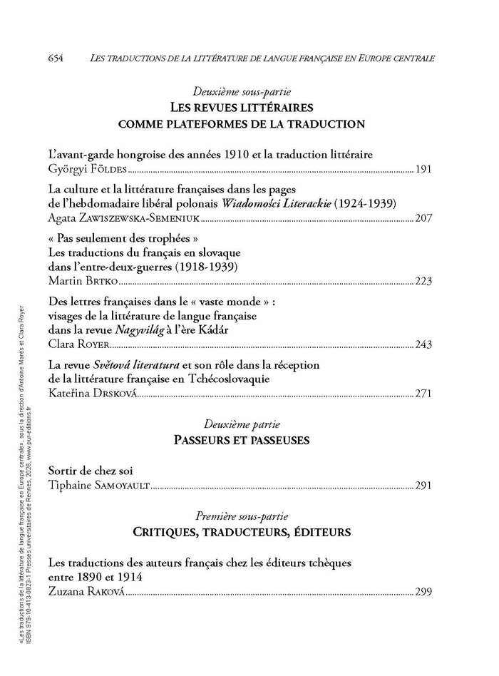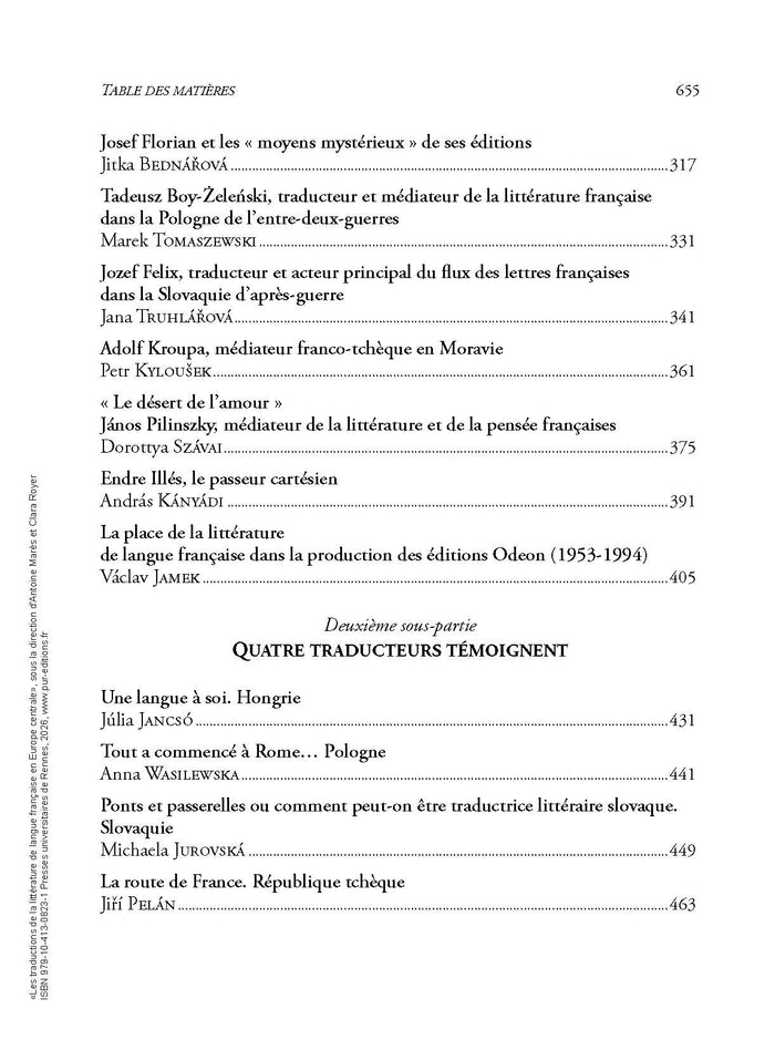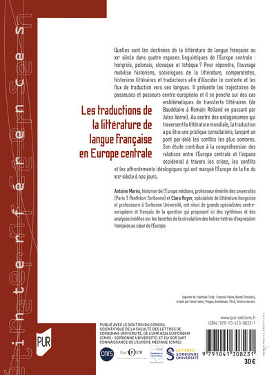 PrésentationQuelles sont les destinées de la littérature de langue française au XXe siècle dans quatre espaces linguistiques de l’Europe centrale  : hongrois, polonais, slovaque et tchèque ? Pour répondre, l’ouvrage mobilise historiens, sociologues de la littérature, comparatistes, historiens littéraires et traducteurs afin d’élucider le contexte et les flux de traduction vers ces langues. Il présente les trajectoires de passeuses et passeurs centre-européens et il se penche sur des cas emblématiques de transferts littéraires (de Baudelaire à Romain Rolland en passant par Jules Verne). Au centre des antagonismes qui traversent la littérature mondiale, la traduction a pu être une pratique consolatoire, lançant un pont par-delà les conflits les plus sombres. Son étude contribue à la compréhension des relations entre l’Europe centrale et l’espace occidental à travers les crises, les conflits et les affrontements idéologiques qui ont marqué l’Europe de la fin du XIXe siècle à nos jours. Afficher moinsAfficher plus