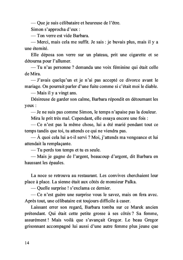 Barbara, invitée à un mariage en Pologne, se retrouve face à un choix difficile. Entre retrouvailles avec un ancien amour et attentes des mariés, elle devra décider de se venger, jouer les sauveurs, ou suivre son propre chemin. Ce roman explore les thèmes de la vengeance, de la rédemption et du pardon, dans un contexte de relations complexes. Afficher moinsAfficher plus