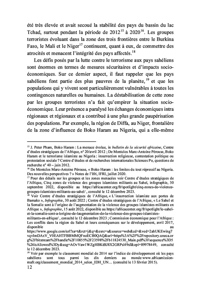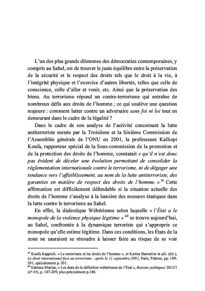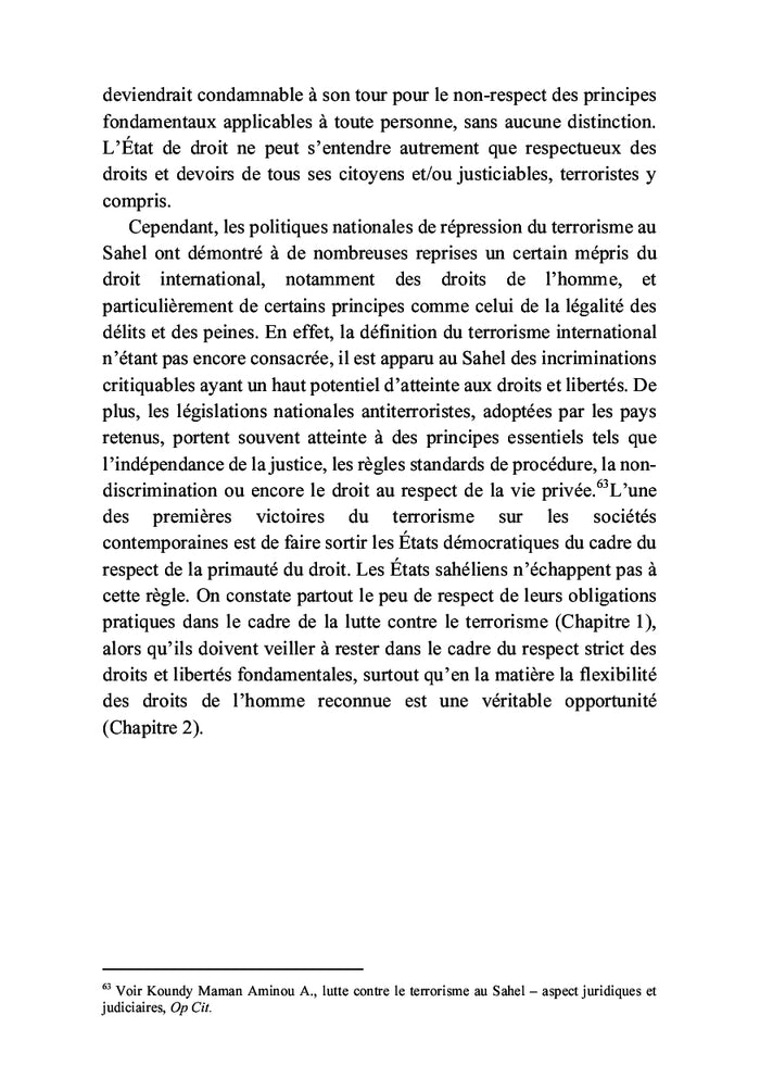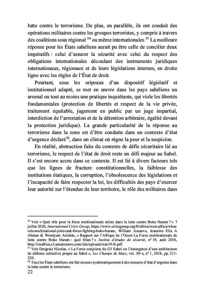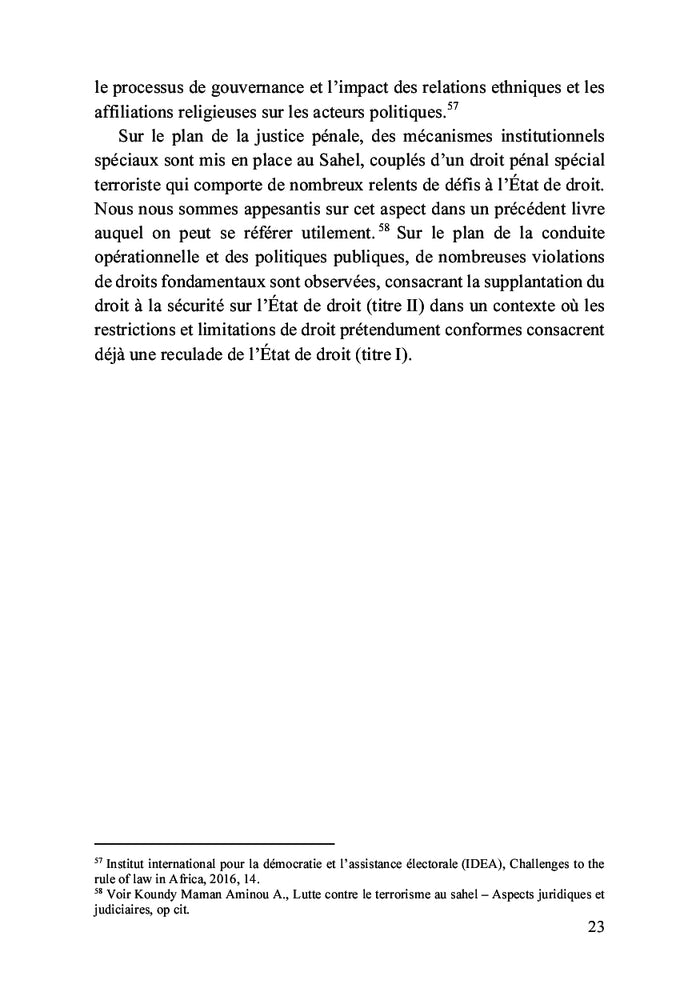 Les États du Sahel ont réagi aux défis posés par les groupes terroristes en adoptant des mesures d'urgence, entraînant un recul de l'État de droit. Dans la lutte contre le terrorisme, des compromis ont été faits au détriment des droits fondamentaux, menaçant ainsi les principes démocratiques. Au nom de la sécurisation, l'État de droit est mis à rude épreuve, conduisant à sa mise en berne et sa supplantation par le droit à la sécurité. À travers une approche globale, cet essai propose une analyse des multiples atteintes faites aux règles de l'État de droit par les groupes terroristes et les acteurs étatiques. Afficher moinsAfficher plus