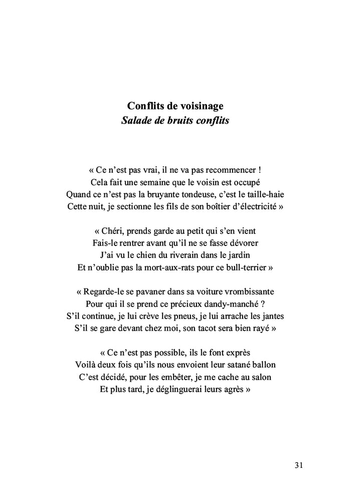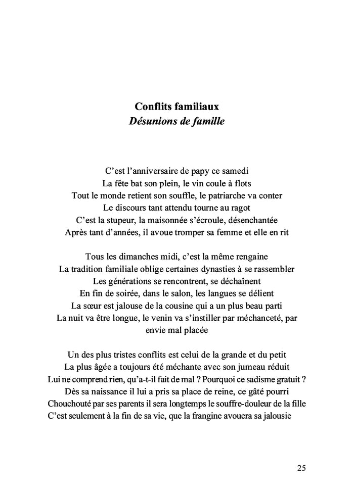 Présentation"Sous un regard amusé, les crises en thèmesSont taillées et partagées, comme des fleurs qu'on s'aimePour mieux comprendre la sociétéLe monde qui nous entoureAvec ses vices et ses charmesLes jeux de mots nous font passerDes rimes aux chaudes larmesDe la triste haine à l'humour« À pleurer de rimes », « Vers deux thèmes »,« Jongler avec les maux »« L'univers des vers unis » et « Les vers de l'amitié »Sont les cinq parties déclinées, décortiquant le présent fabliauQui ouvrent les esprits, qui poussent le lecteur à raisonner" Afficher moinsAfficher plus