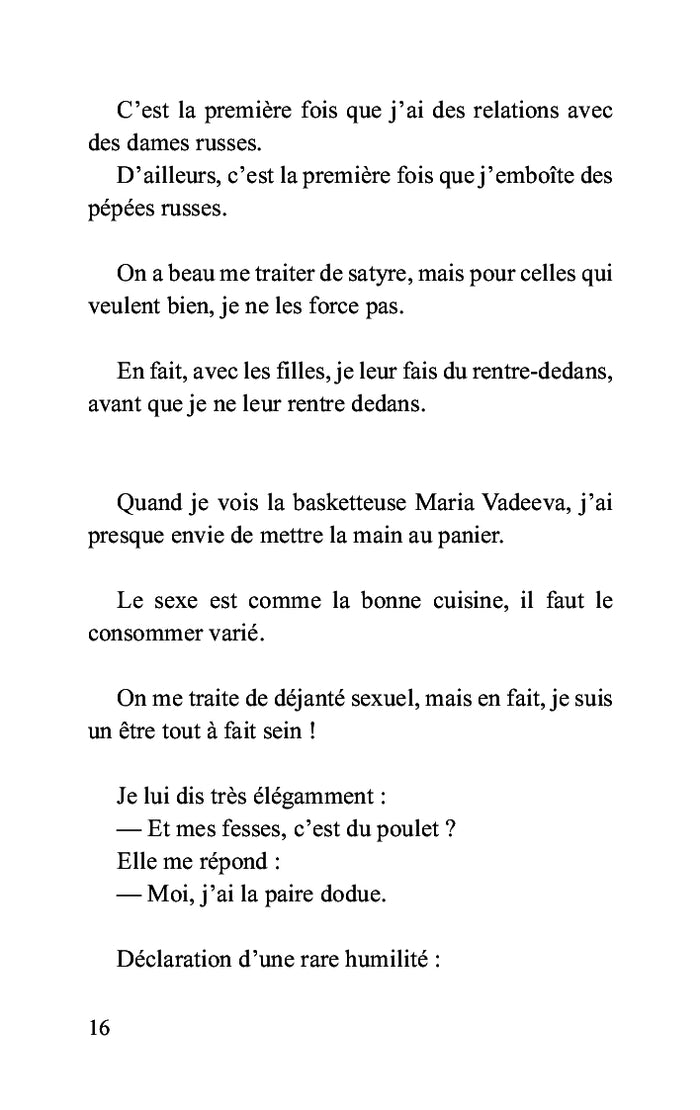 PrésentationL'humour est la poésie de l'absurde transforme le quotidien en un terrain de jeu où tout est matière à rire et à réflexion. Cinéma, musique, politique, sexe, même la zoologie : rien n'échappe à la plume électriquement décalée de Bruno Zarev. Entre blagues inattendues et devinettes satiriques, chaque page fait éclater les normes pour nous plonger dans un univers aussi absurde qu'irrésistible. Êtes-vous prêts à découvrir ce qui se cache derrière le masque du rire ? Afficher moinsAfficher plus